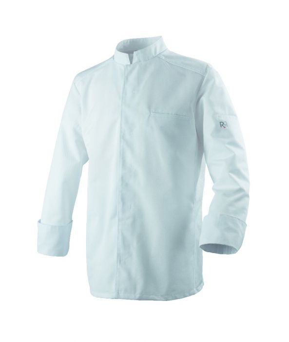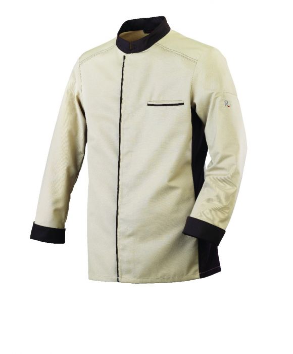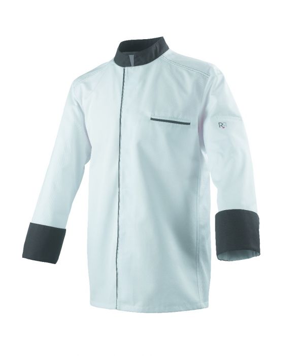 Veste de cuisine Col officier de couleur Boutons pression cachés Surpiqûres contrastées : plastron + épaules + dos Liseré contrasté : plastron + poche poitrine Revers bas de manches contrastés Bande en maille respirante sur les côtés Poche stylo sur manche