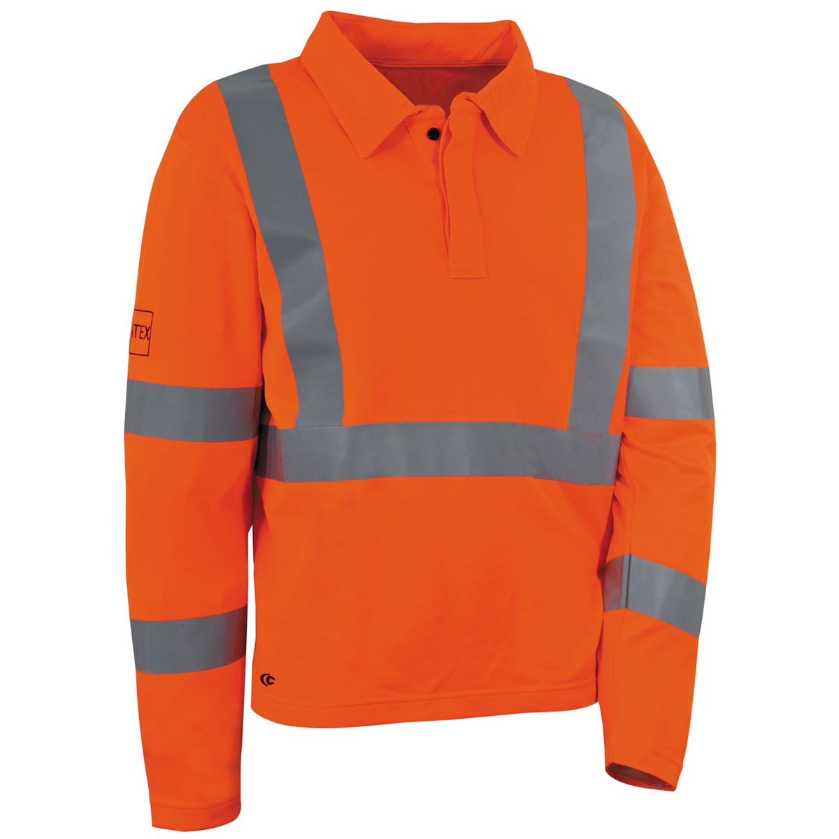 Polo haute visibilité avec bandes réfléchissantes anti-flamme horizontales et verticales thermosoudées. Broderie “ATEX” sur la manche droite. Col avec fermeture centrale cachée sous patte. Conseillé en domaines ATEX. Dos de la veste plus long. Fentes sur les côtés. Pictogrammes de norme brodés sur la manche gauche.