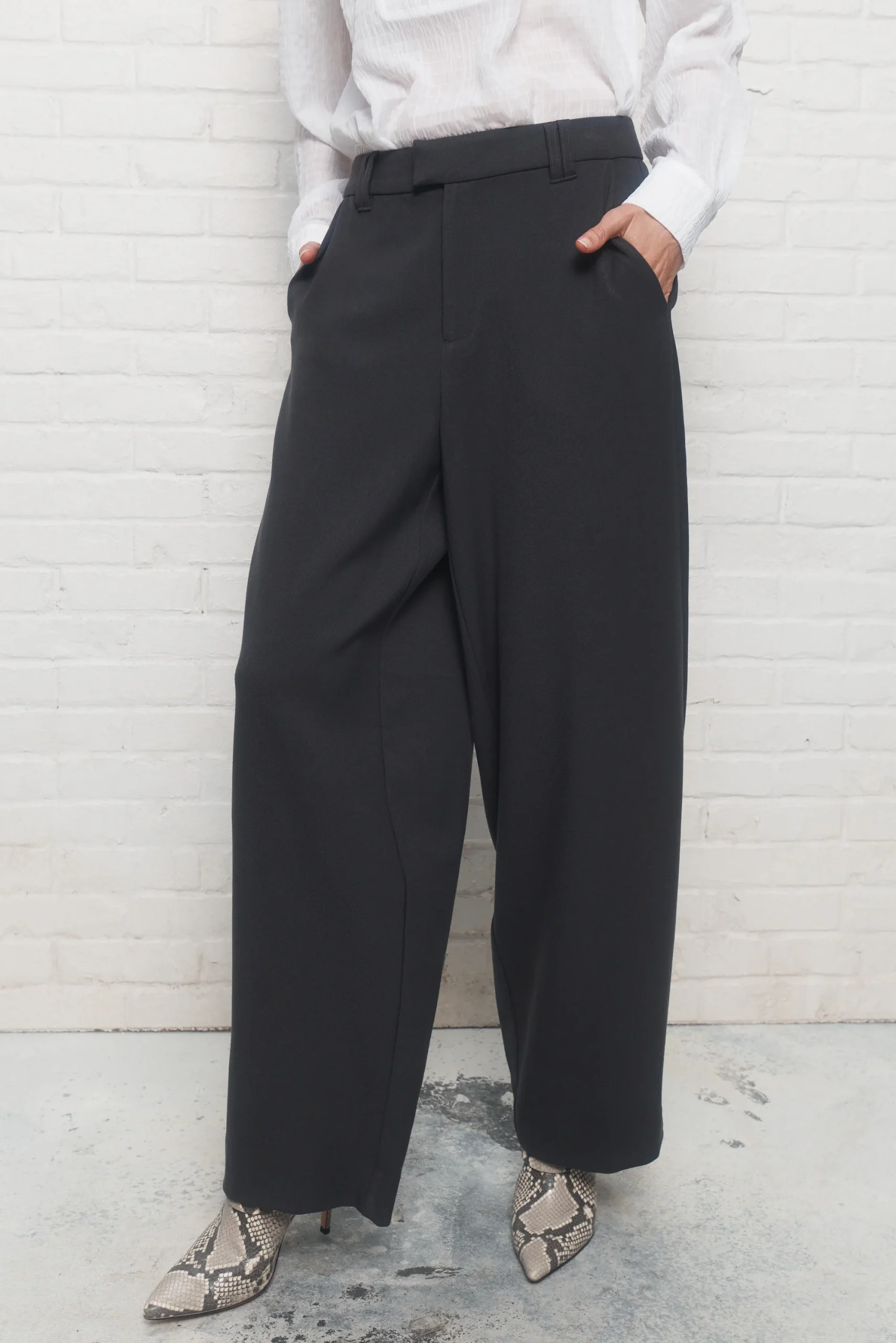 Conseils grandeurVous pouvez prendre votre grandeur habituelle de pantalon. Si vous avez tendance à varier entre deux tailles, nous conseillons d’opter pour la plus petite taille des deux. Spécifications Coupe surdimensionnée oversizeTaille basseFourche basseEntrejambe : 30-1/2″Tissu extensible Bande de taille élastique au dosPoches en angle au devantFermeture à glissière et crochet dissimulésPassants à ceinturePinces au dosFausse […]