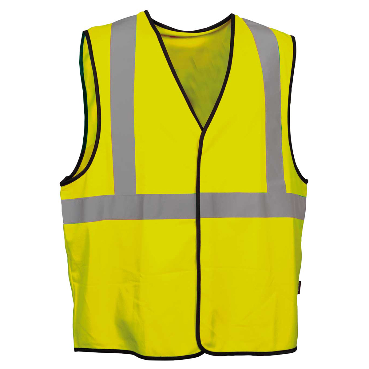 Chasuble avec 2 bandes réfléchissantes verticales + 1 bande horizontale. Complètement bordé. 100% polyester.
