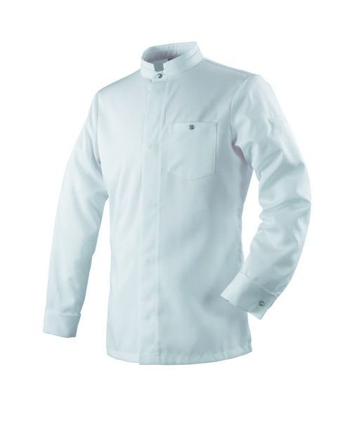 veste de cuisine Double col officier Boutons griffes en corne pour l’élégance Poche poitrine passepoilée Boutons pression cachés Soufflet en maille COOL PLUS® dans le dos pour plus d’aisance Finition bas de manche poignets mousquetaires Poche stylo sur manche Fentes côtés