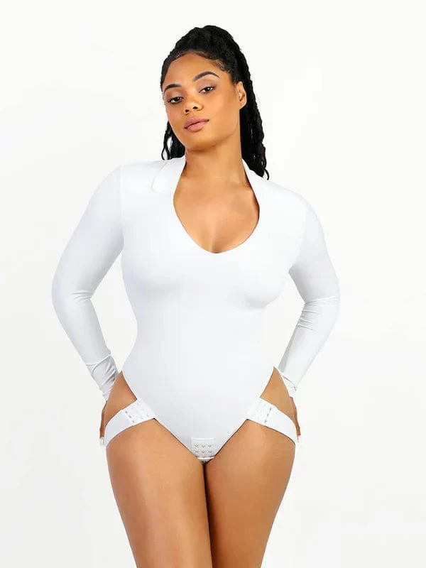 Body sculptant à manches longues avec décolleté en V plongeant et string