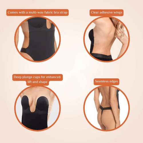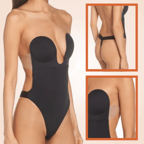 - Les bonnets moulés doublés d’adhésif et les ailettes : le body shaper dos nu maintient votre nouveau décolleté juste là où vous en avez besoin. Une bande de tissu assortie ajoute confort et soutien au haut de ce body plongeant, qui n’est pas conçu pour une couverture totale.