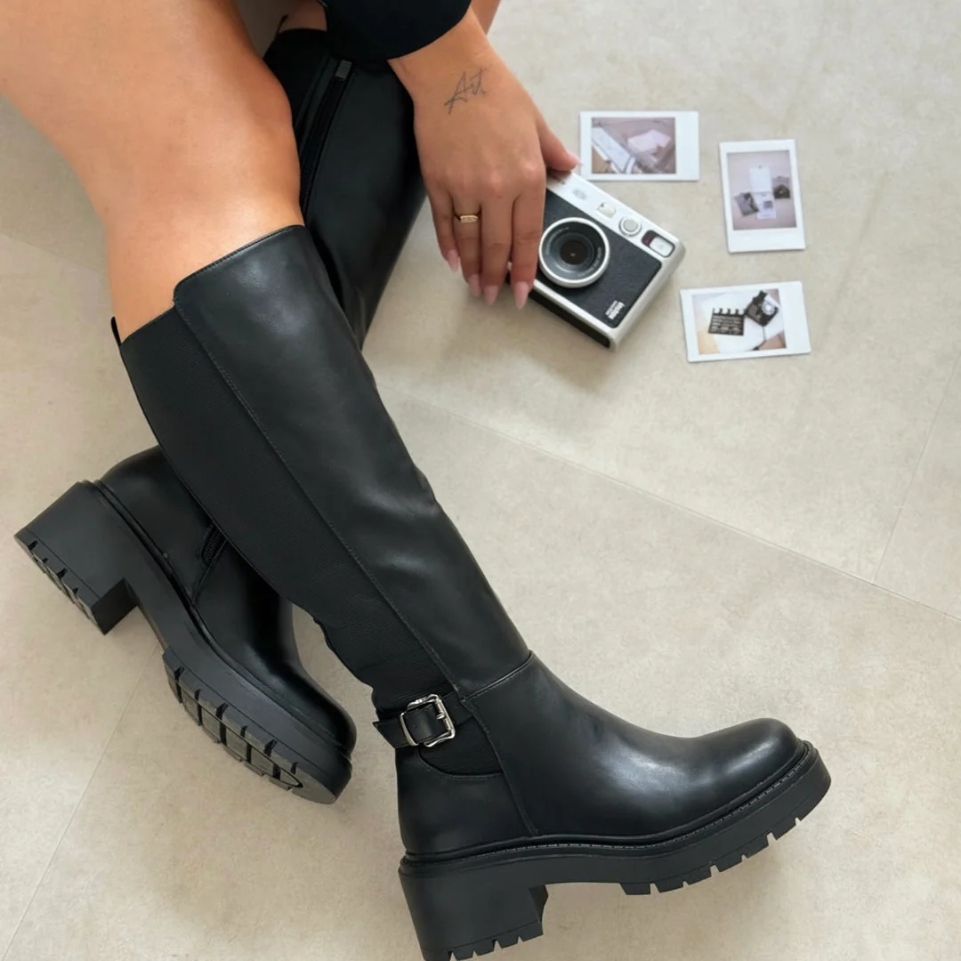 🖤 Adoptez un style rock et moderne avec les bottes Serena ! En cuir noir souple, elles se distinguent par leur boucle latérale et leur semelle crantée à talon bloc pour confort et stabilité ✨.