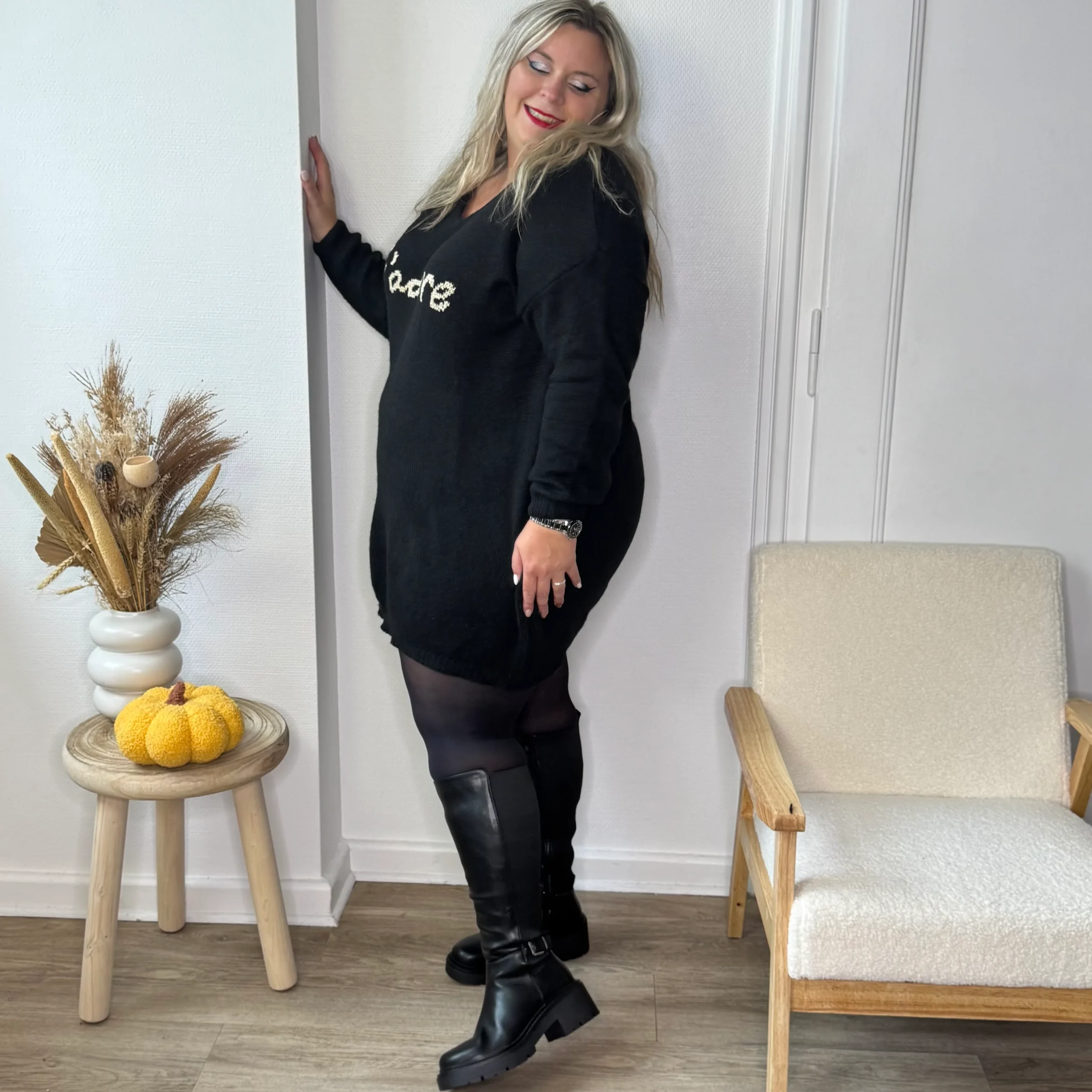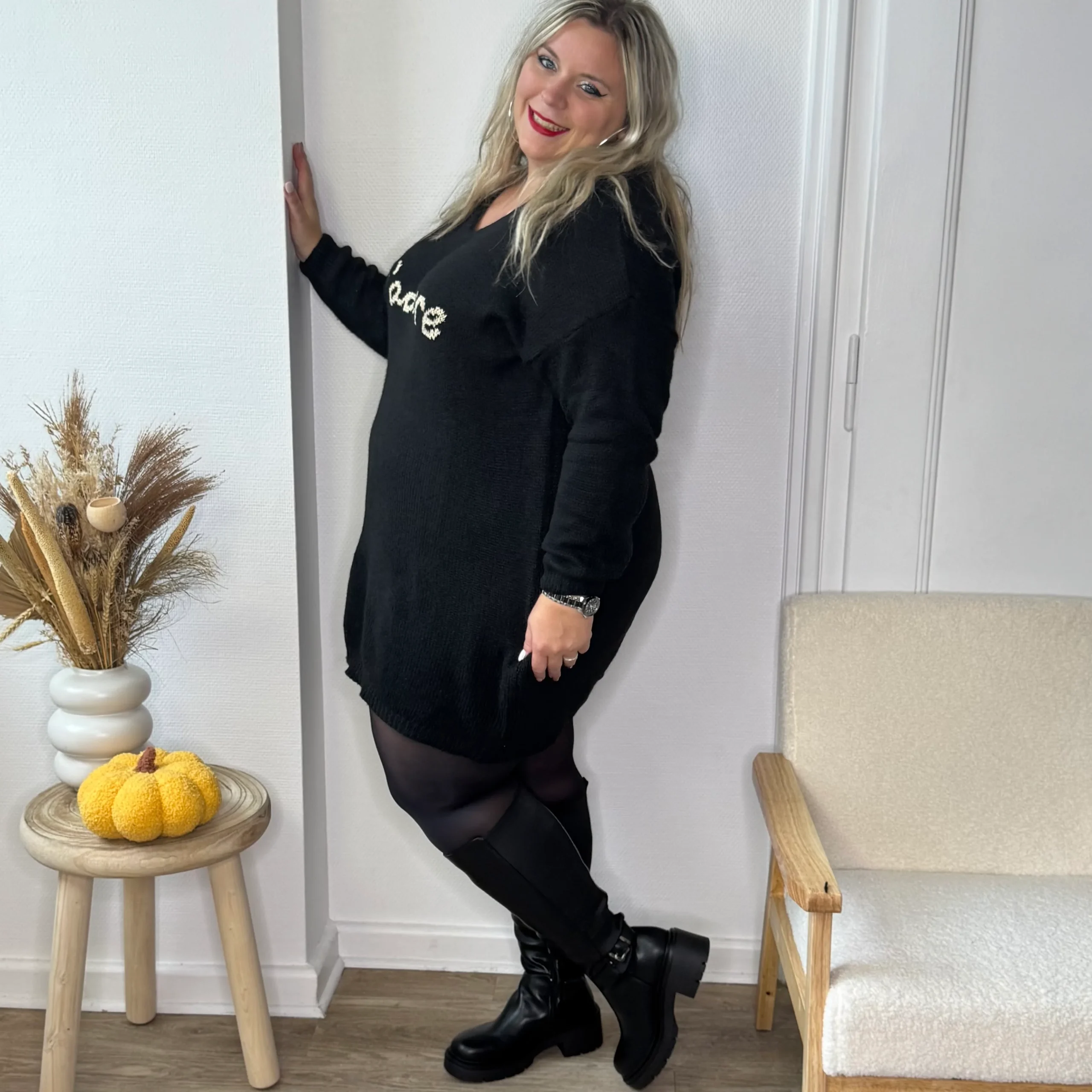 Déborah (robe pull noire) a un tour de mollet de 48 cm pour une taille 39, et Lauryn, également en 39, les bottes leur vont grâce à leur matière stretch au niveau du mollet.