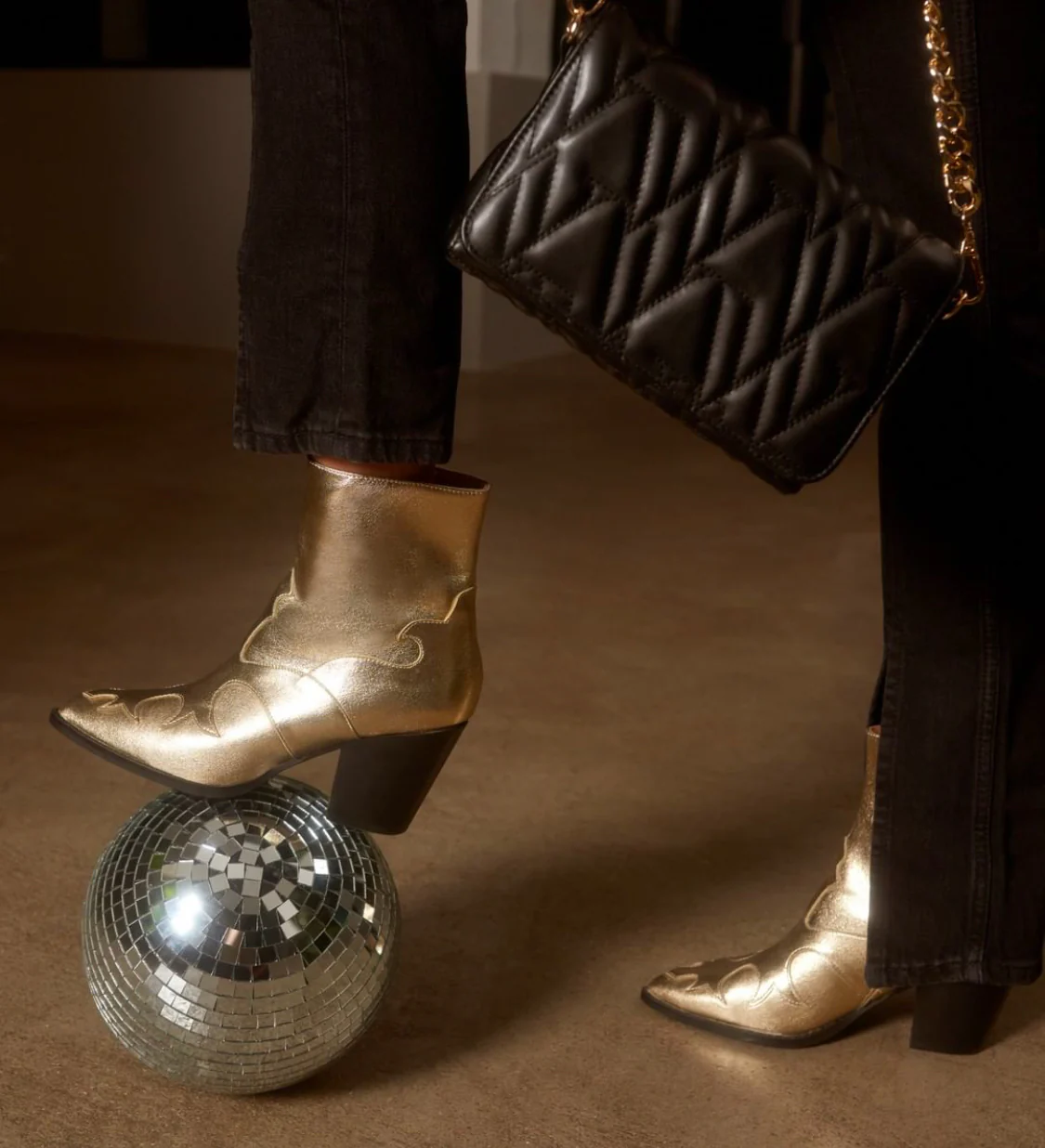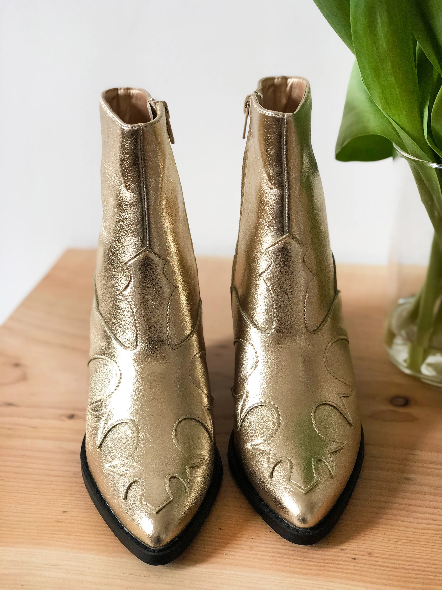 Découvez CLAUDIA, nos bottines style santiags en similicuir or champagne texturé