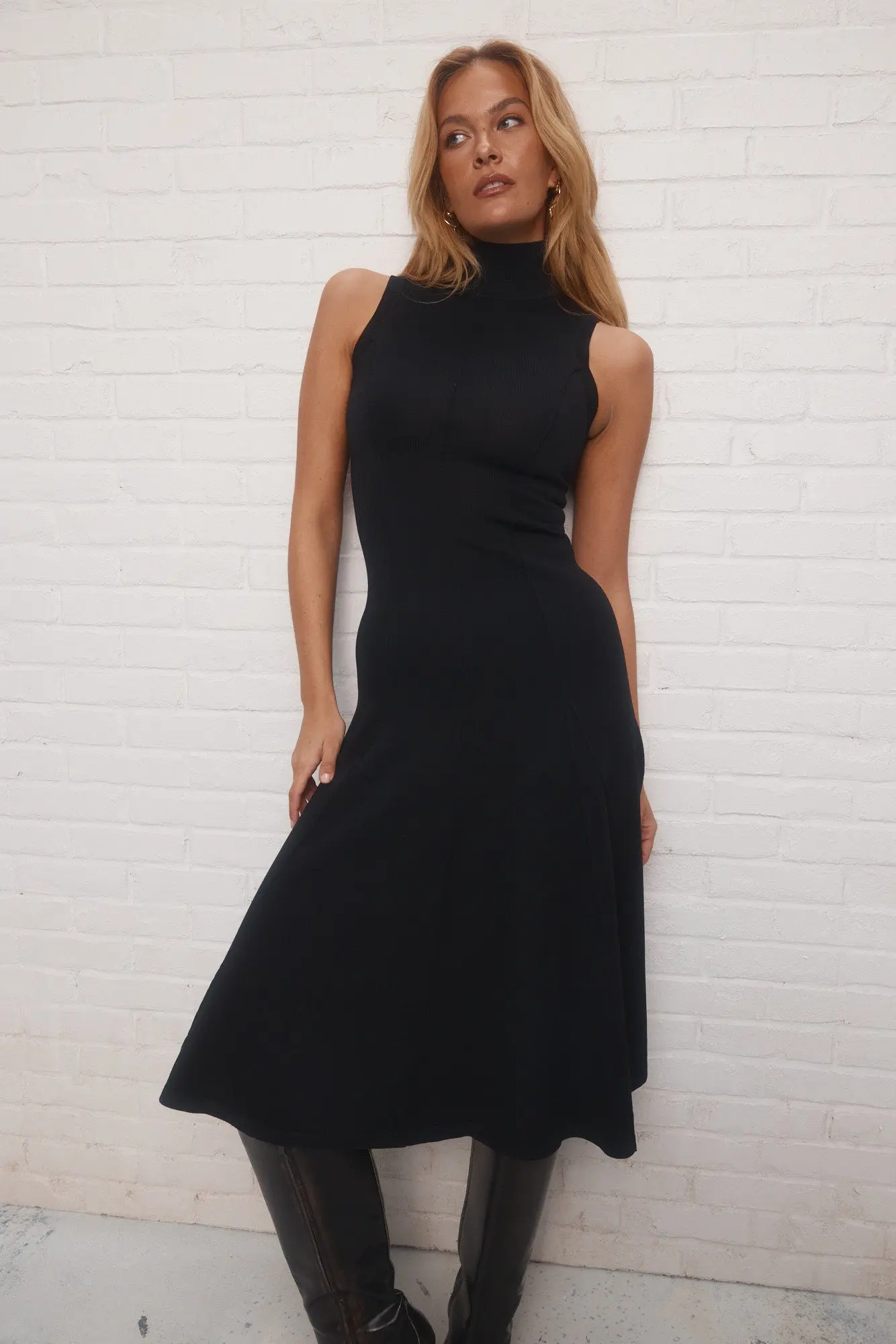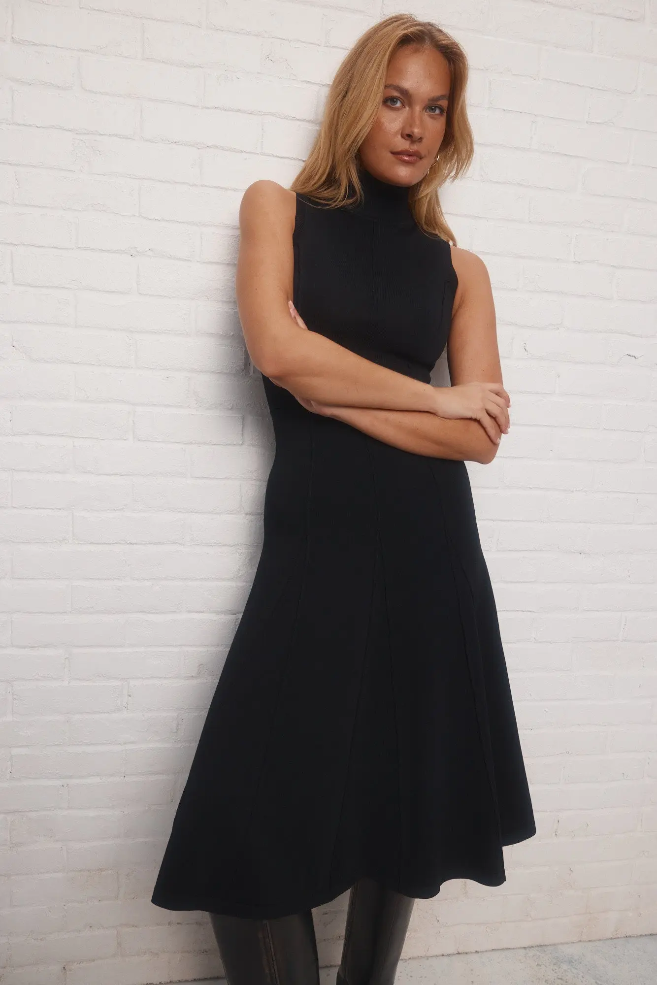 La robe noire en tricot Braxton met vos épaules en valeur. Son col montant et ses découpes flattent la silhouette, tandis que ses empiècements dans le bas créent un volume stylé.