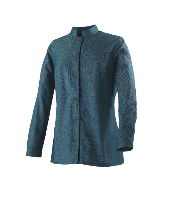 Veste de cuisine Col officier Boutons pressions calottes vieilli Intérieur de patte de boutonnage contrasté bleu Bande de finition de propreté contrastée à l’intérieur du col Surpiqûres contrastées coloris bleu Intérieur des fentes de manche contrasté en bleu Poche plaquée poitrine Modèle Homme : BOVI