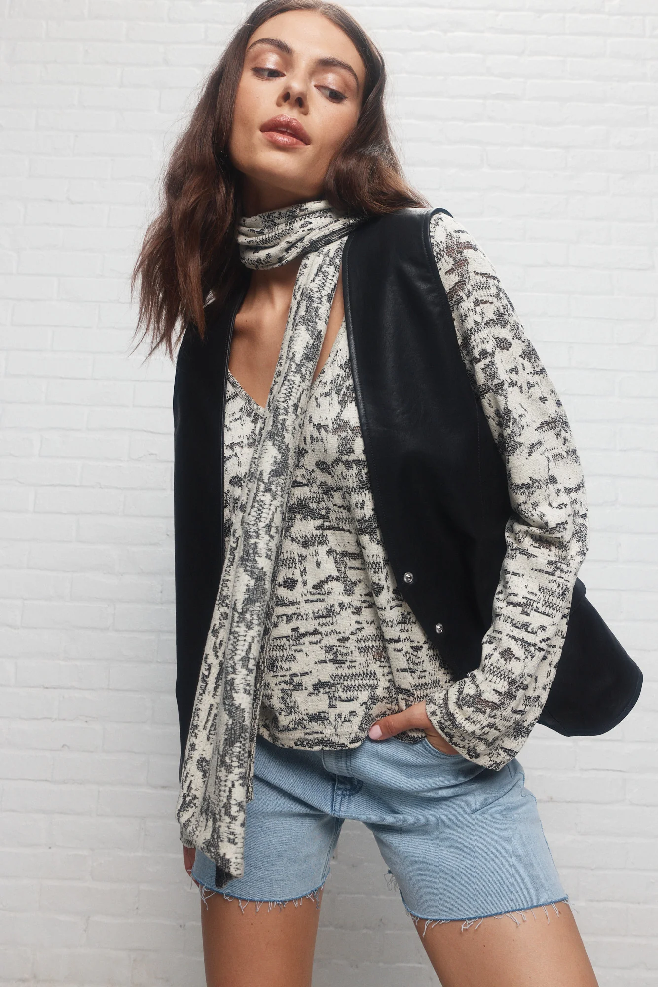 – Pour un style féminin et romantique, portez le chandail crème à motif et foulard intégré avec une jupe.