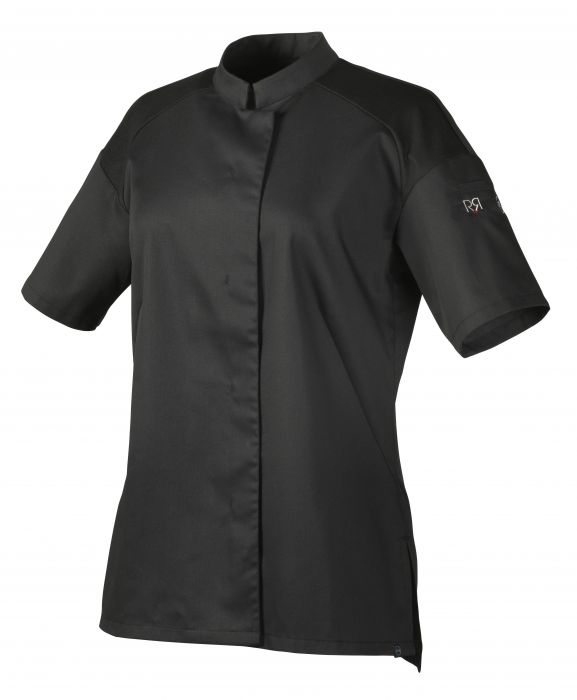 Veste de cuisine Col officier Devant fermé par boutons pression cachés Longues pinces devant Empiècement en maille aux épaules devant et dos Manches courtes finies par ourlets Poche stylo sur manche gauche Fentes bas de vêtement Vignette tissée et logo 37,5
