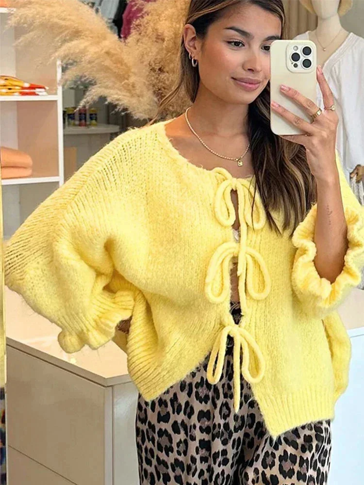 Cardigan femme jaune avec nœuds et front ouvert