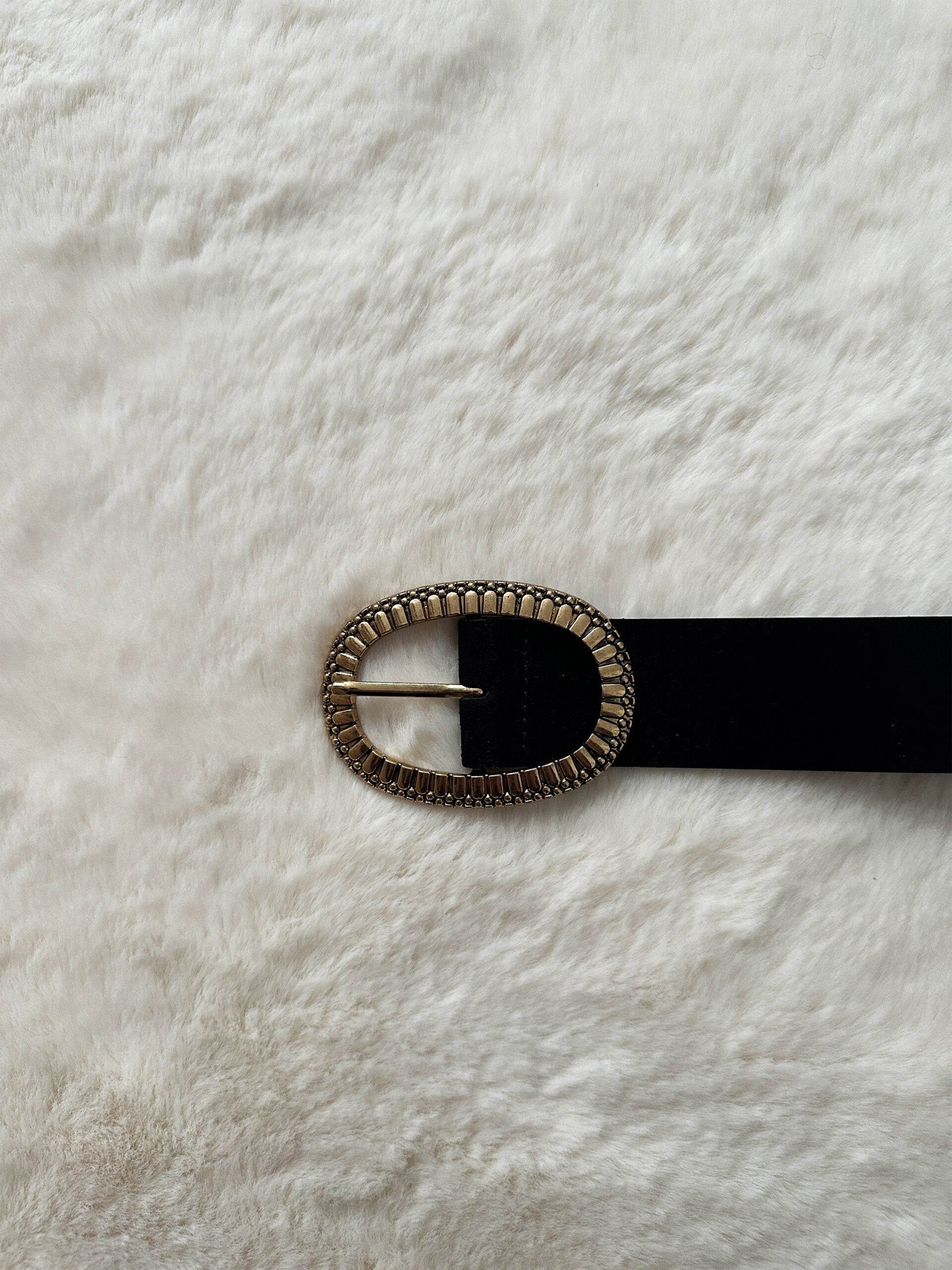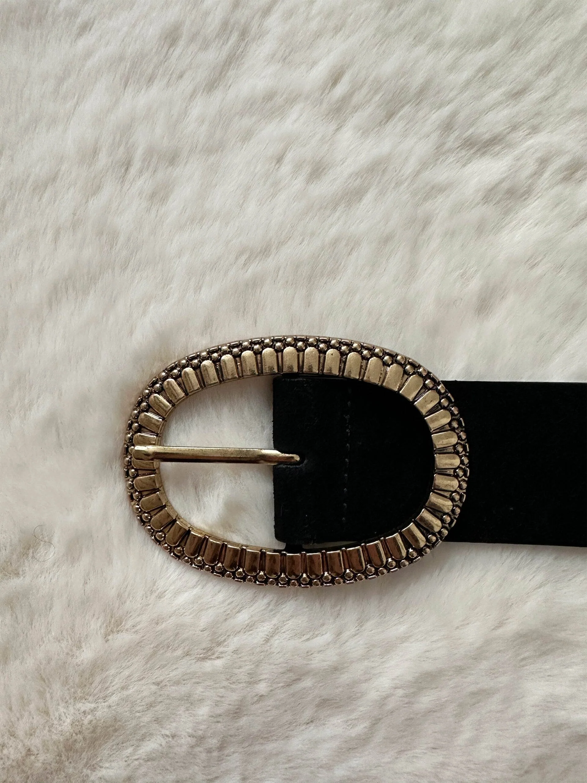 Apportez une touche d’élégance intemporelle à votre tenue avec Olivia, notre ceinture en cuir noir véritable, ornée d’une boucle dorée à l’aspect vieilli, au design raffiné et texturé.