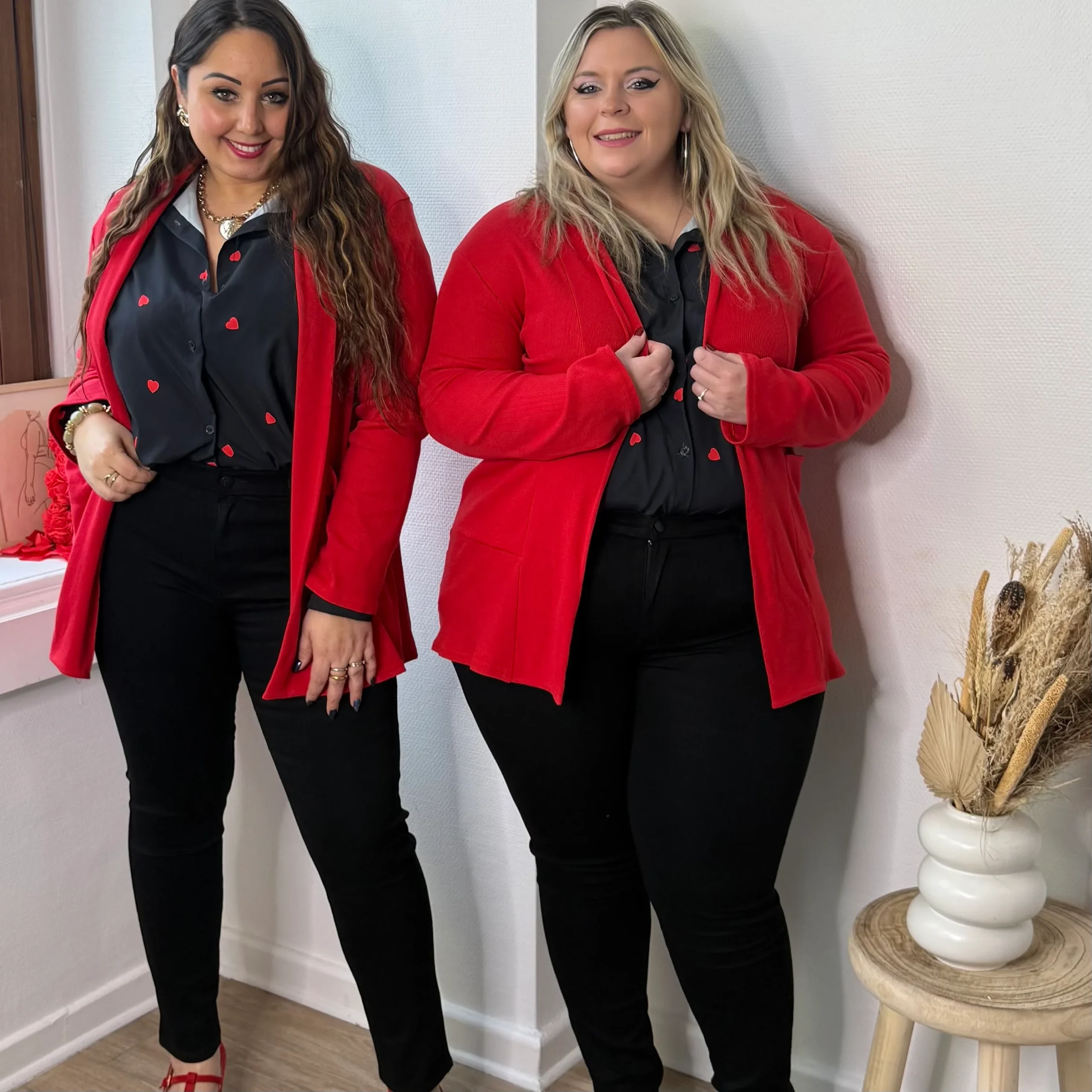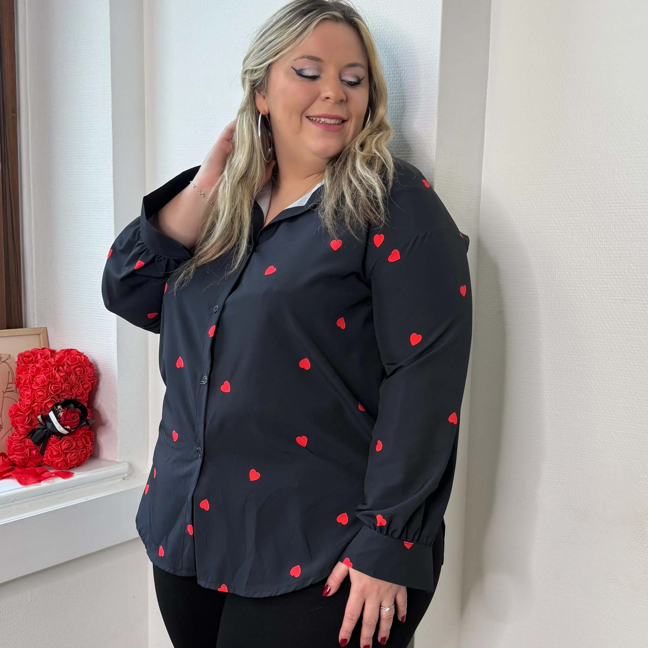Féminin et plein de charme, ce chemisier noir est délicatement orné d’un motif cœur rouge, apportant une touche originale et élégante ❤️🖤.