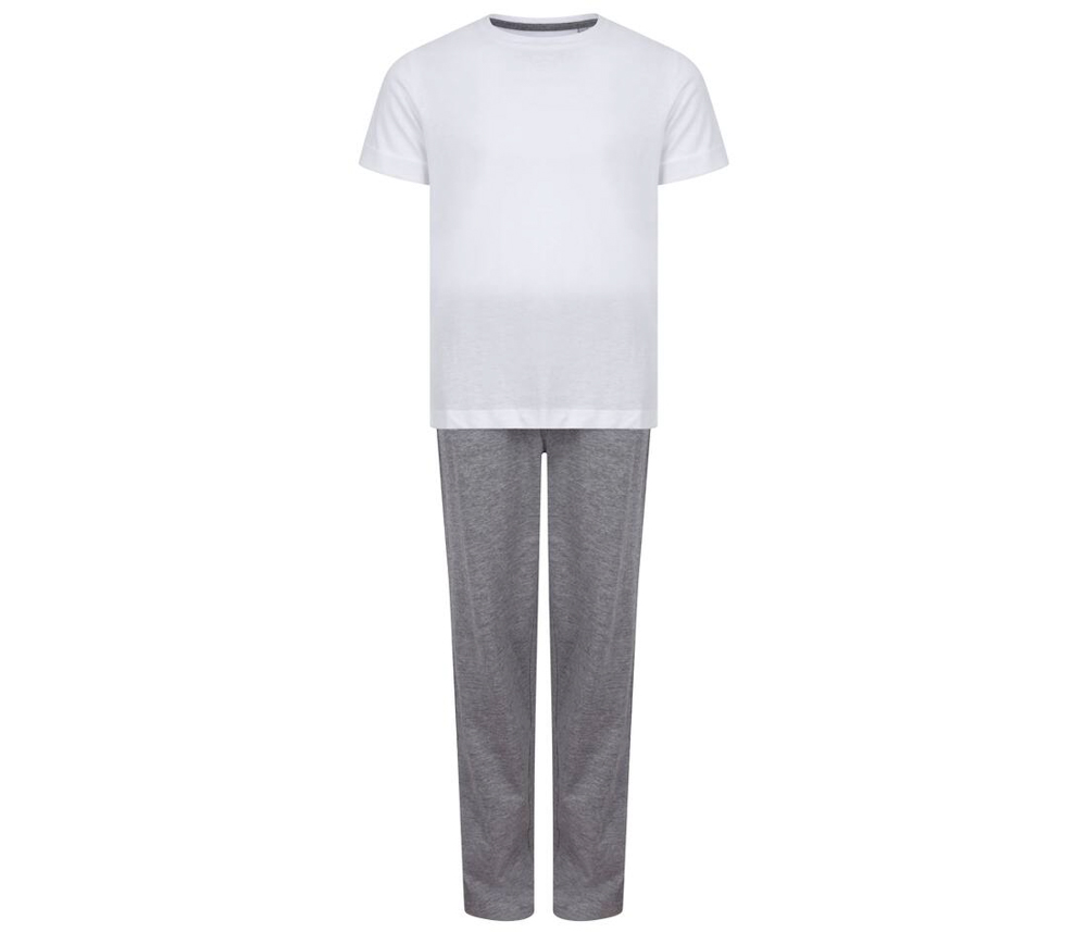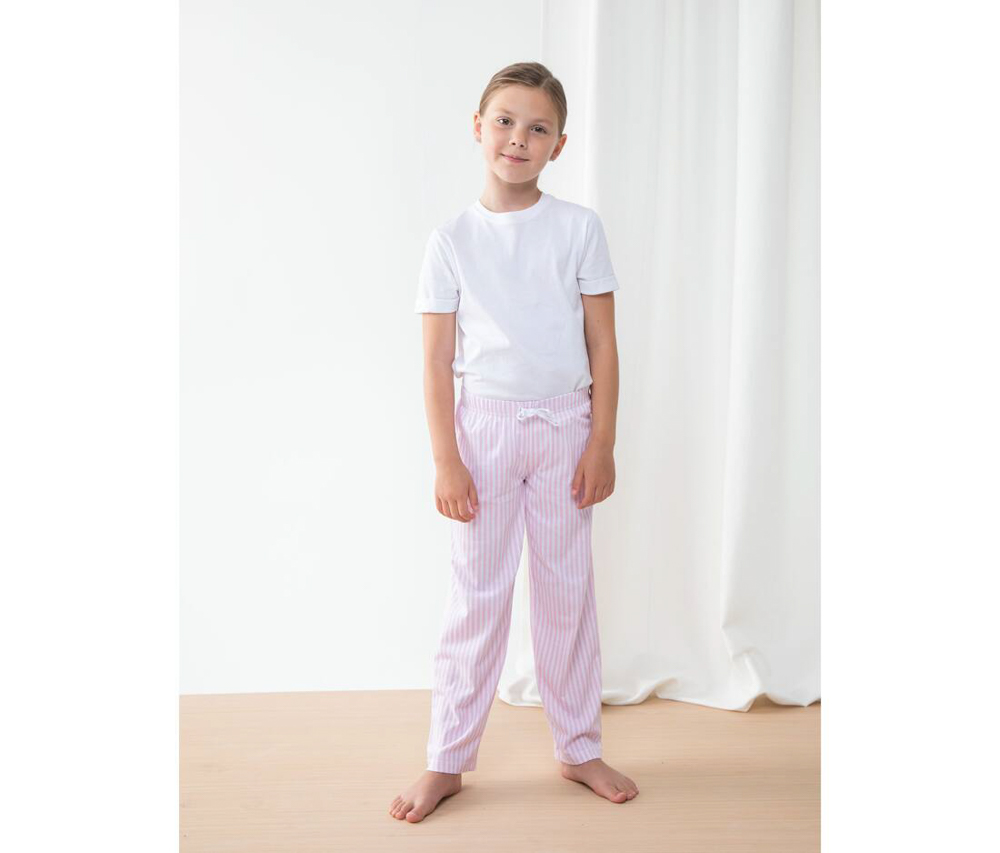 Ensemble pyjama enfant. Ensemble : t-shirt blanc et pantalon contrasté. Double coutures à la taille du tee-shirt. Taille du pantalon élastiquée avec cordon. Vendu dans un sac contrasté avec cordon. Étiquette détachable. 100% coton jersey.