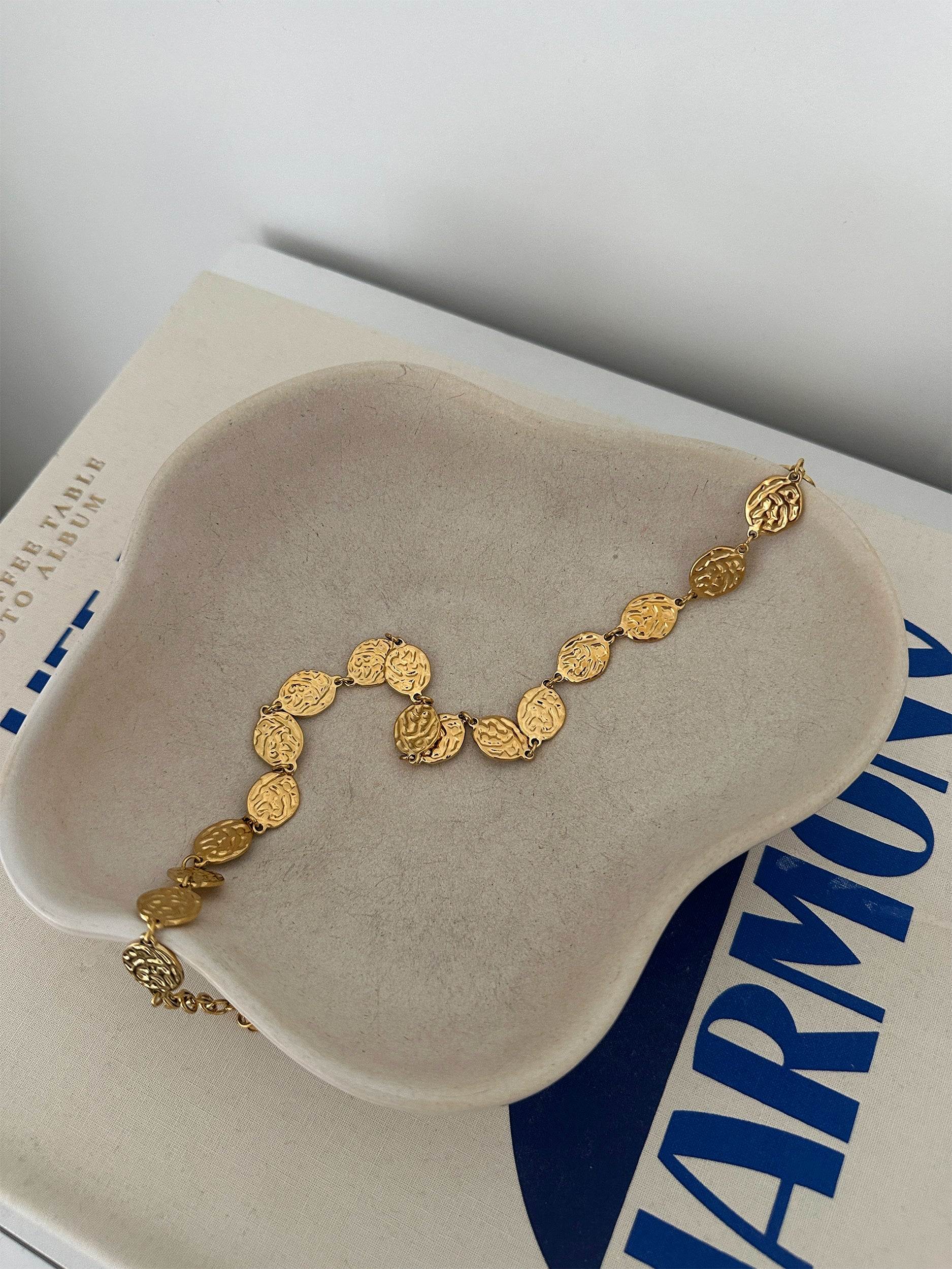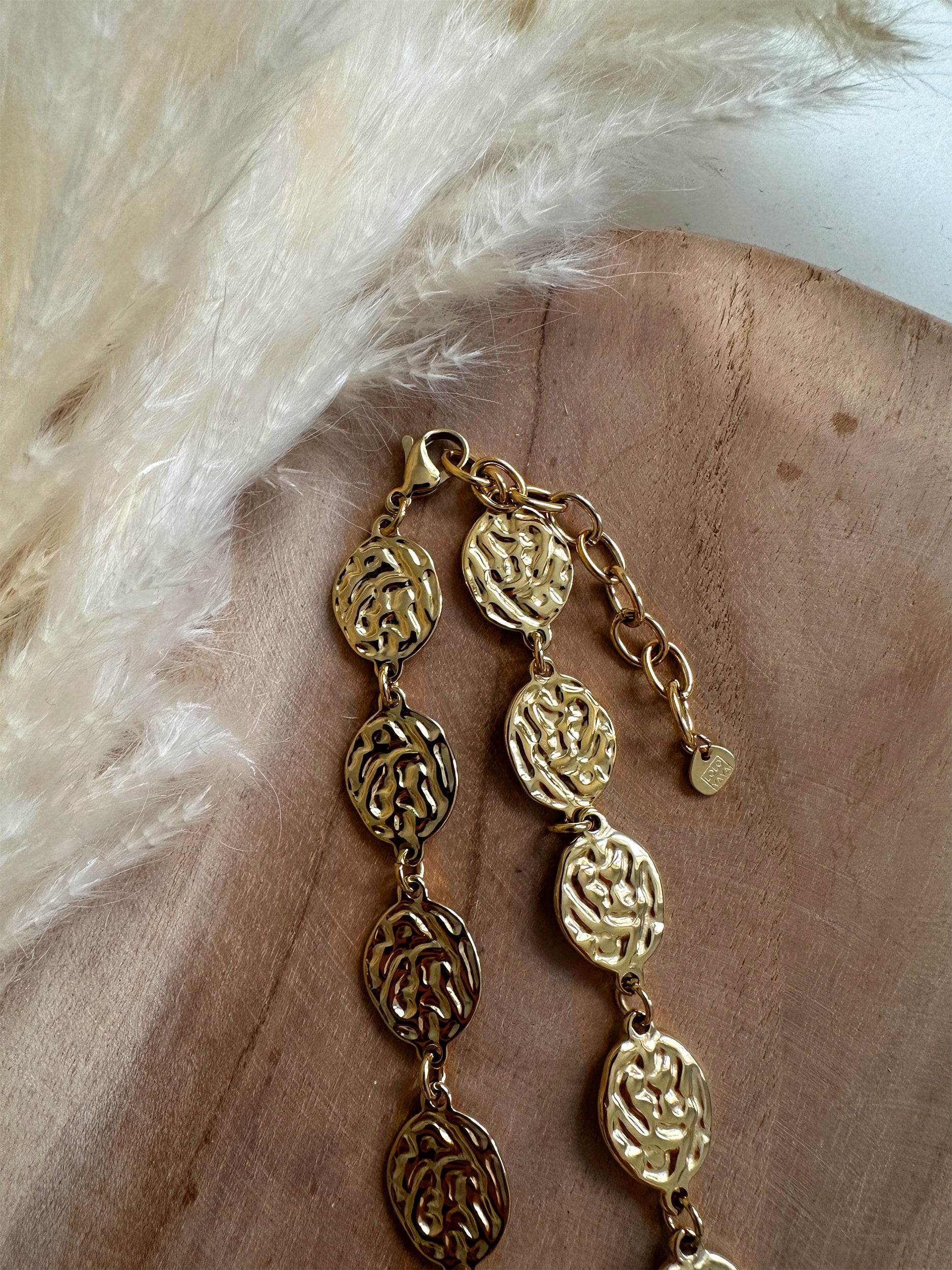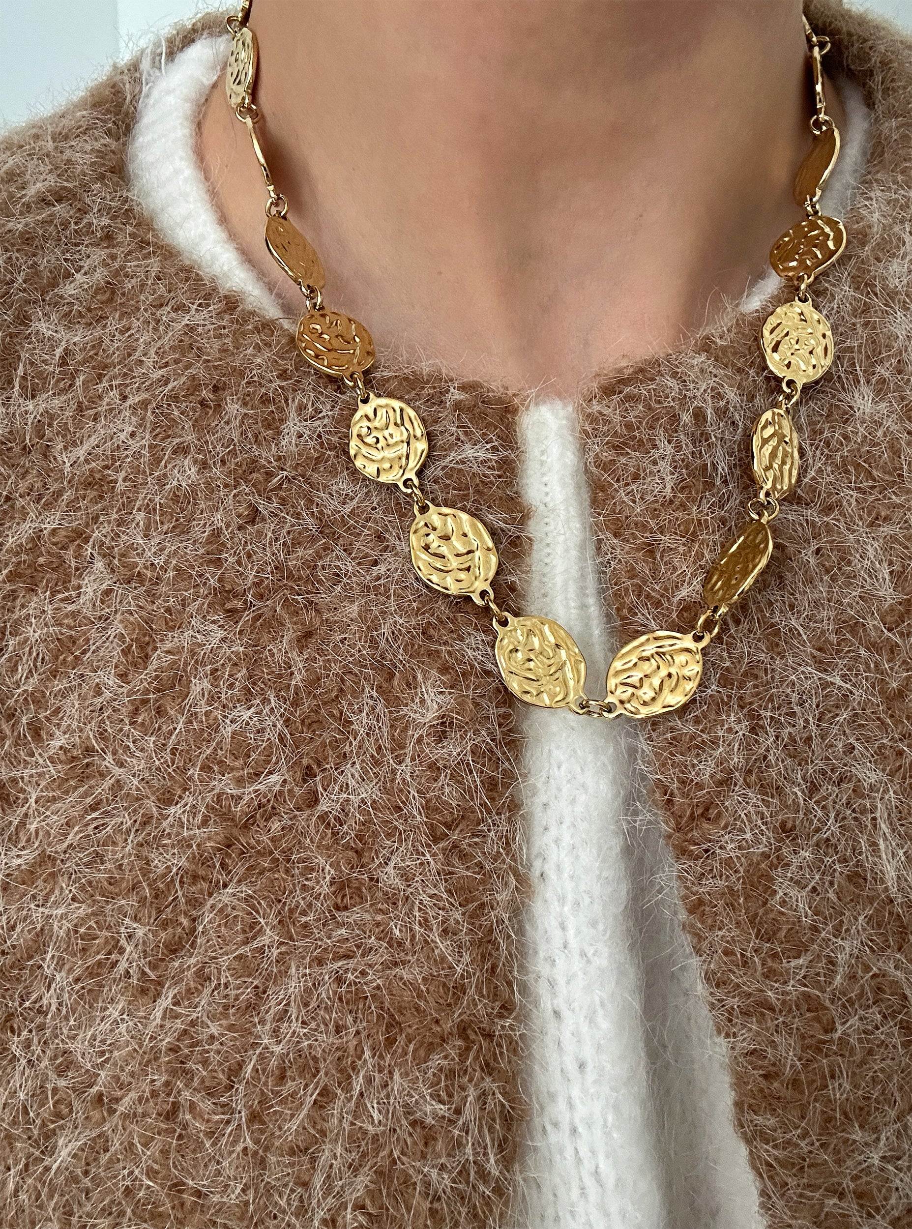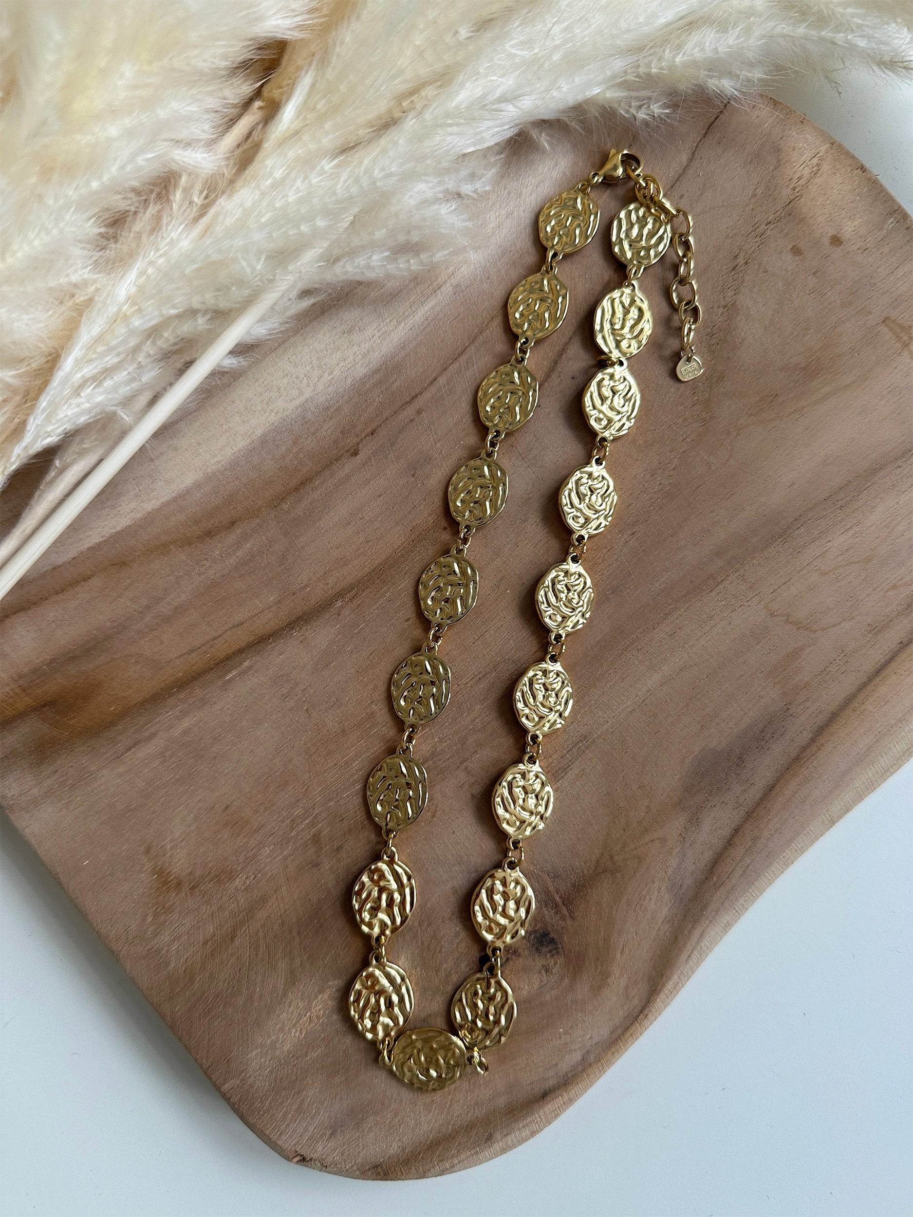 Le collier Kaellis est le bijou qui mixe élégance et caractère ! Avec ses maillons ronds finement ciselés en acier inoxydable doré, il attire la lumière et apporte une touche sophistiquée et originale à toutes vos tenues.