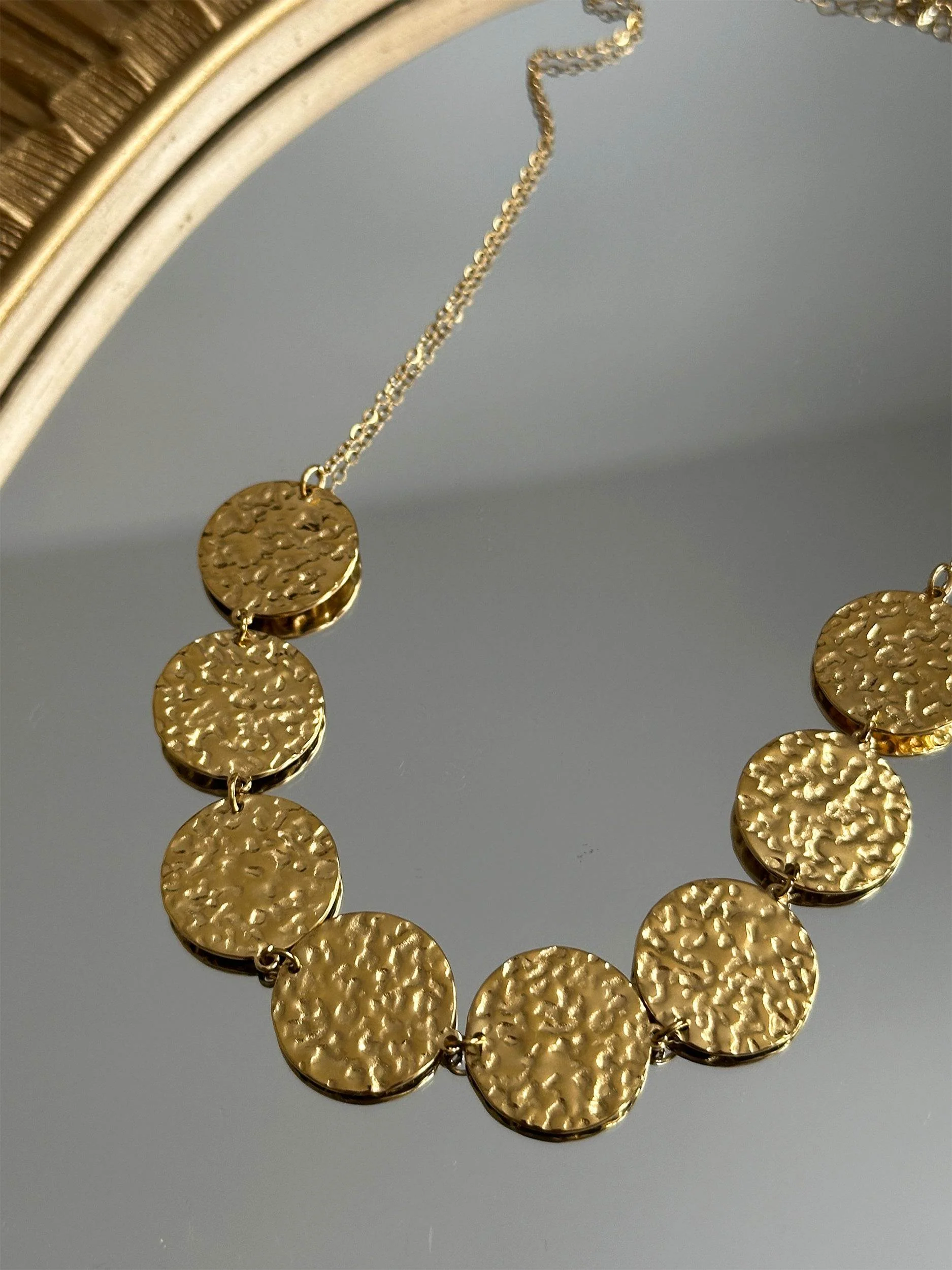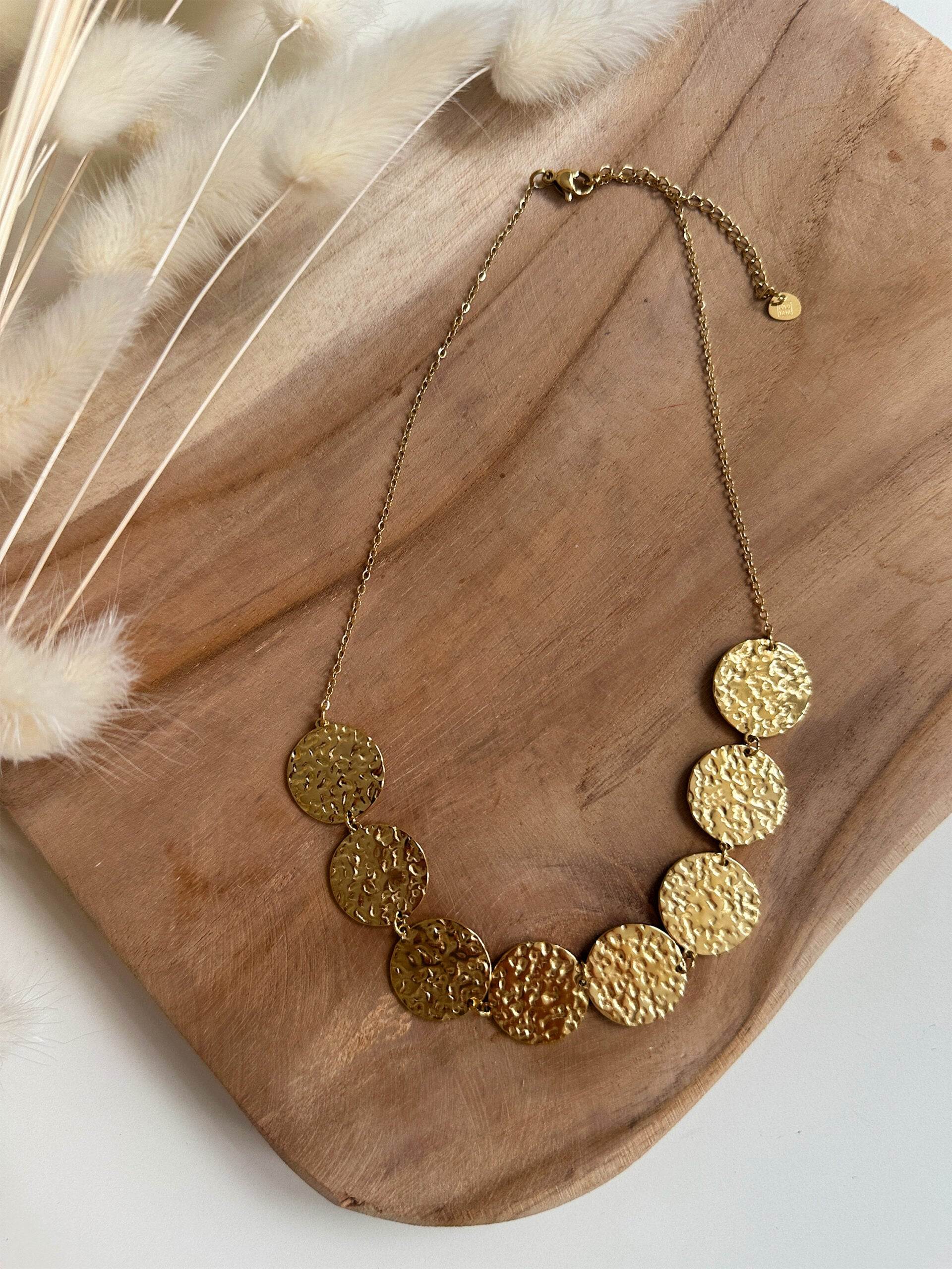 Le collier Niva, c’est la touche ultra stylée qui fait passer votre look au niveau supérieur. Ses pastilles dorées martelées donnent un effet couture et lumineux en fait une pièce incontournable.