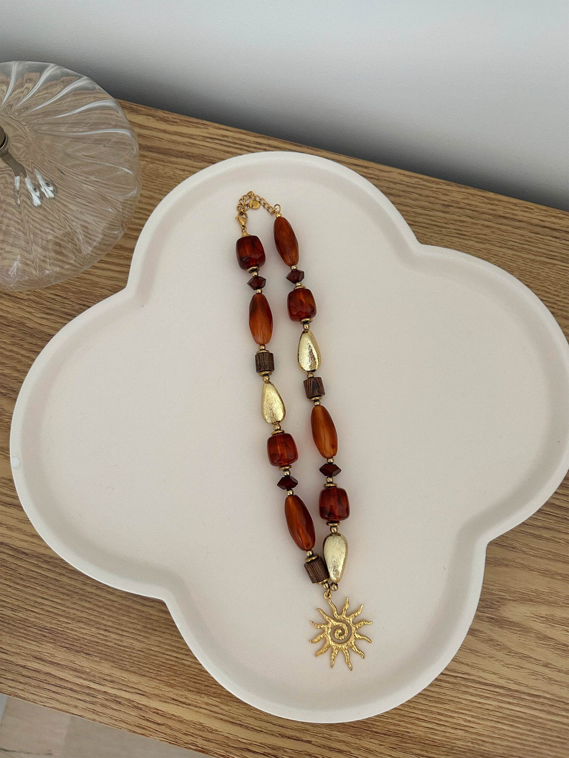 Le collier Orenda, c’est le bijou qui rayonne autant que toi ! Avec ses perles aux reflets ambres, ses maillons dorés texturés et son pendentif soleil, il apporte une vie solaire, mystique et ultra stylée à n’importe quel look.