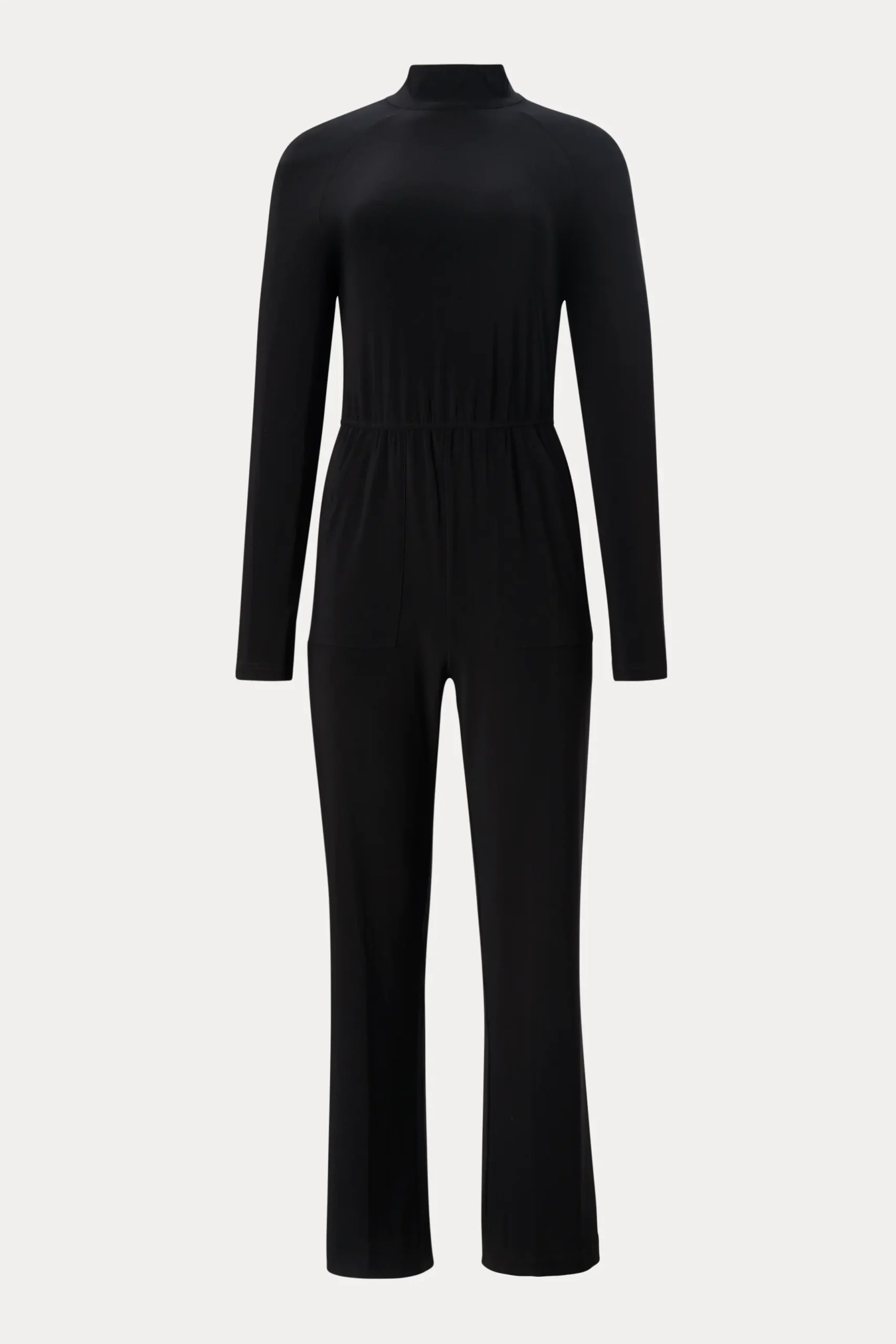 La combinaison noire col montant Corder allonge la silhouette grâce à son haut ajusté et à ses jambes évasées. Extensible, elle est hyper confortable et son dos ouvert crée un effet impeccable.