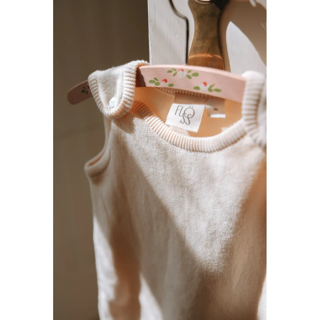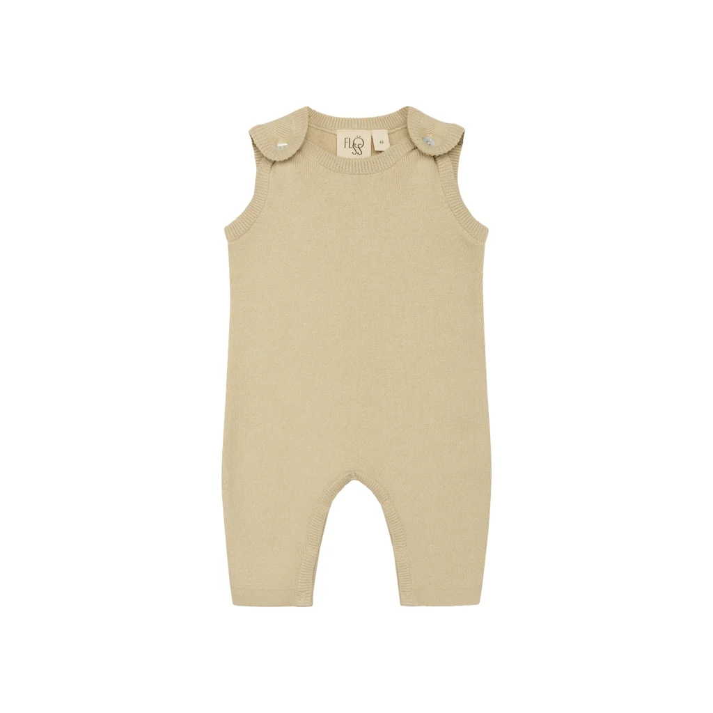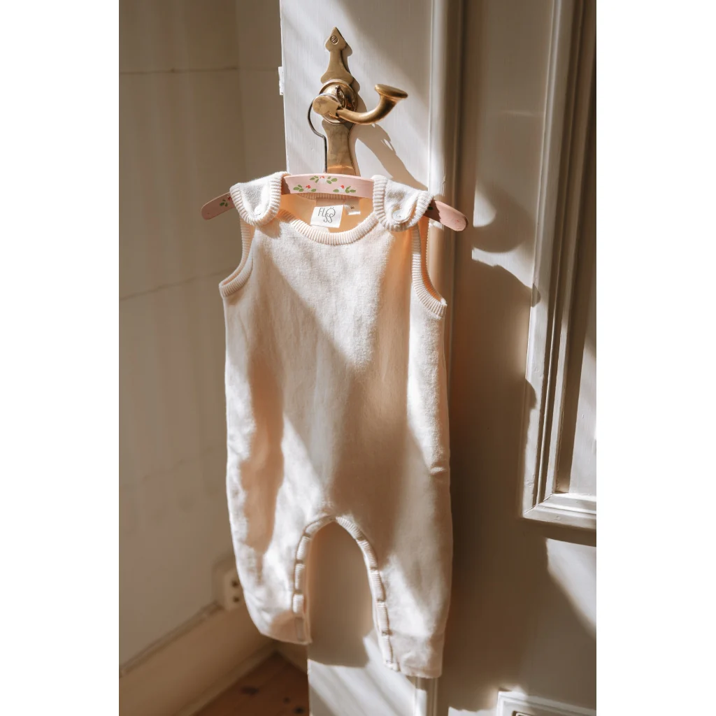 Kaya overall is zacht gebreid, gemaakt van biologisch katoen. Mouwloos, parelmoeren knopen voor sluiting en drukknopen voor gemakkelijk aankleden.
