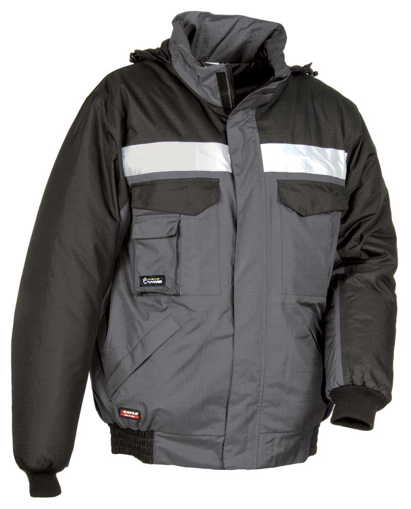 Blouson avec 2 poches larges à l’avant avec snap. 2 poches poitrine avec patte. Bande horizontale réfléchissante avant et arrière Capuche ajustable enroulée dans le col. Coutures étanchées. Poche pour téléphone mobile en tissu E-WARD. Poignets élastiques. Tissu ripstop. Zip intérieure au fond. 100% polyester enduit PVC, 215 g/m², DOUBLURE: 100% polyester, REMBOURRAGE: 100% polyester 160 g/m²