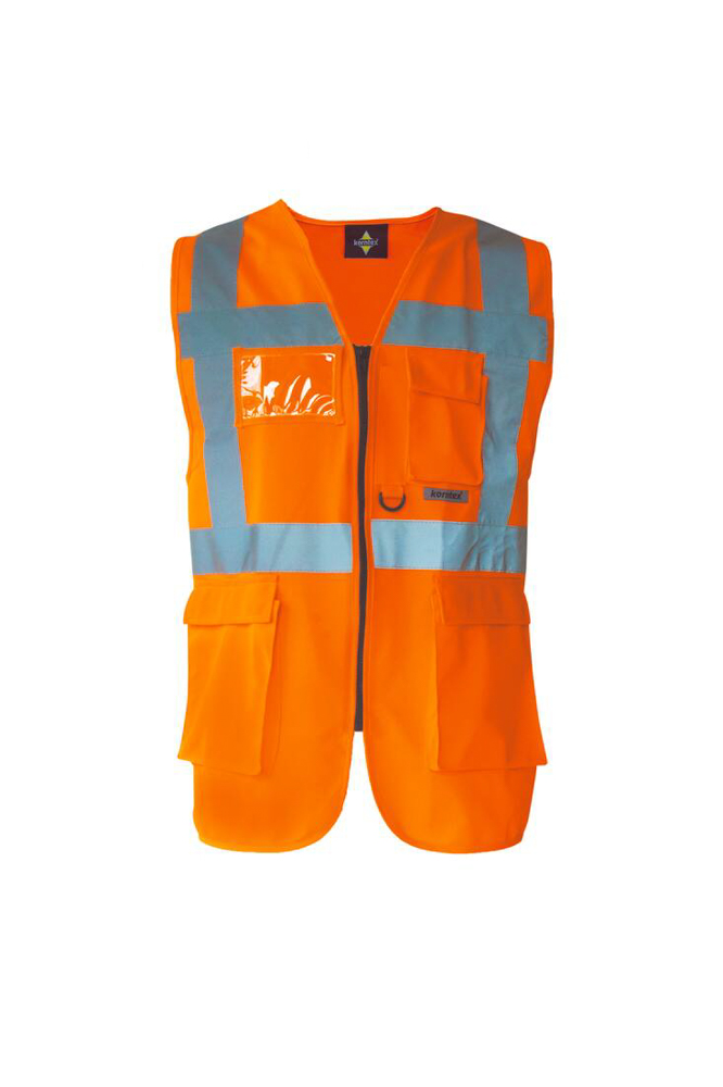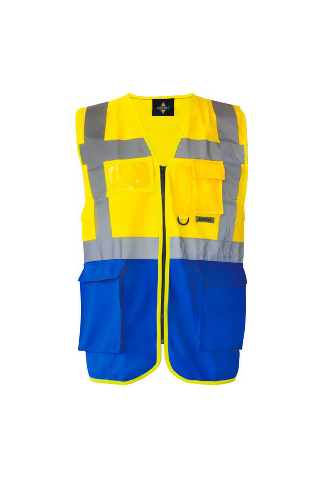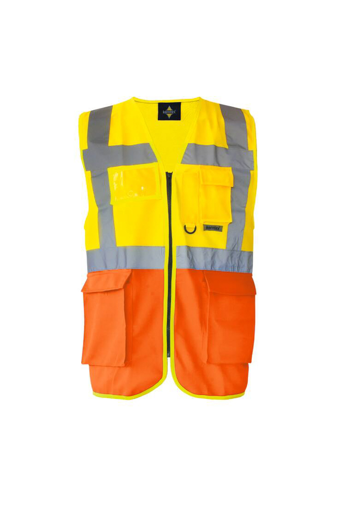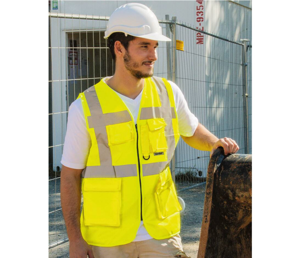 Chasuble multi-poches. Fermeture zippée. Approuvé spécification EN ISO20471:2013. Bandes rétro réfléchissantes de 5cm de large (une sur la poitrine, une à la taille et 2 sur les épaules). 100% polyester.