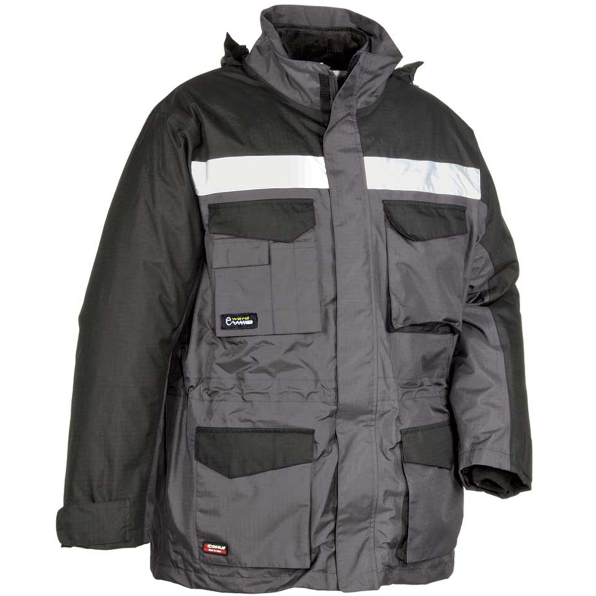 Veste extérieure: 2 poches larges à l’avant. 2 poches poitrine avec patte. Bande horizontale réfléchissante avant et arrière. Capuche ajustable enroulée dans le col. Coutures thermosoudées. Poche pour téléphone mobile en tissu E-WARD. Taille ajustable avec cordon de serrage. tissu ripstop Veste intérieure: 2 poches à l’avant. Manches amovibles avec zip.