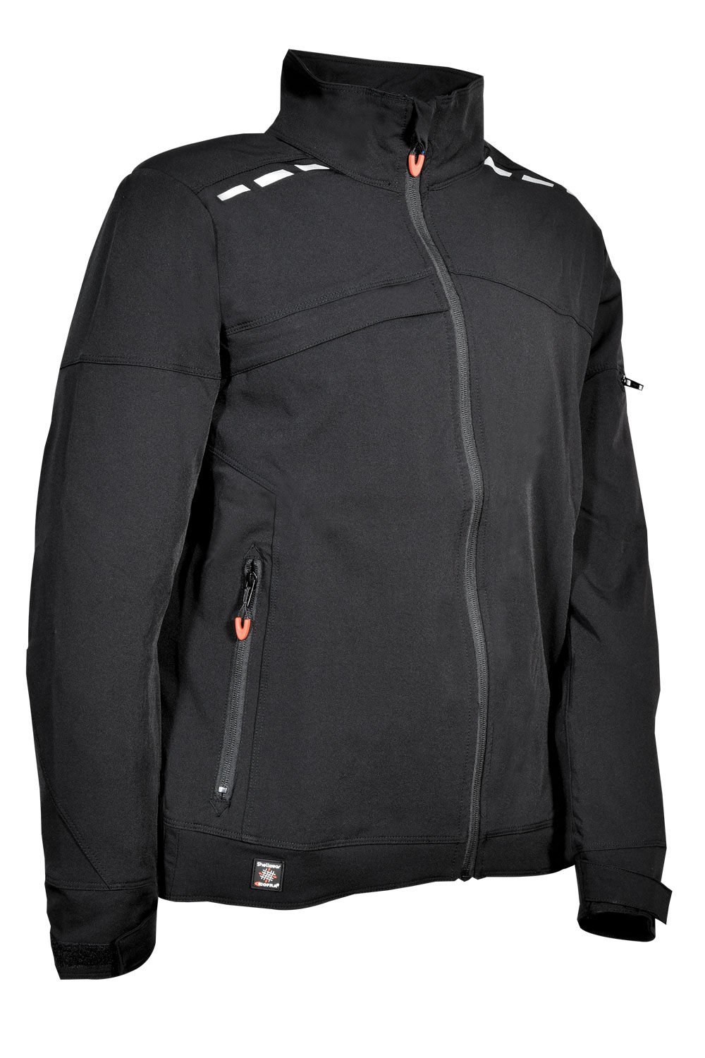 2 poches à l’avant avec zip. Inserts réfléchissants. Larges poches intérieures. Manches à coupe ergonomique. Ouverture centrale avec zip. Poche poitrine pour téléphone portable en tissu E-WARD et bague porte-badge avec fermeture éclaire. Poignets ajustables. Rabat de protection au niveau du menton. Tissu élastique. Une poche sur la manche gauche avec fermeture zip. 94% nylon – 6% élasthanne.