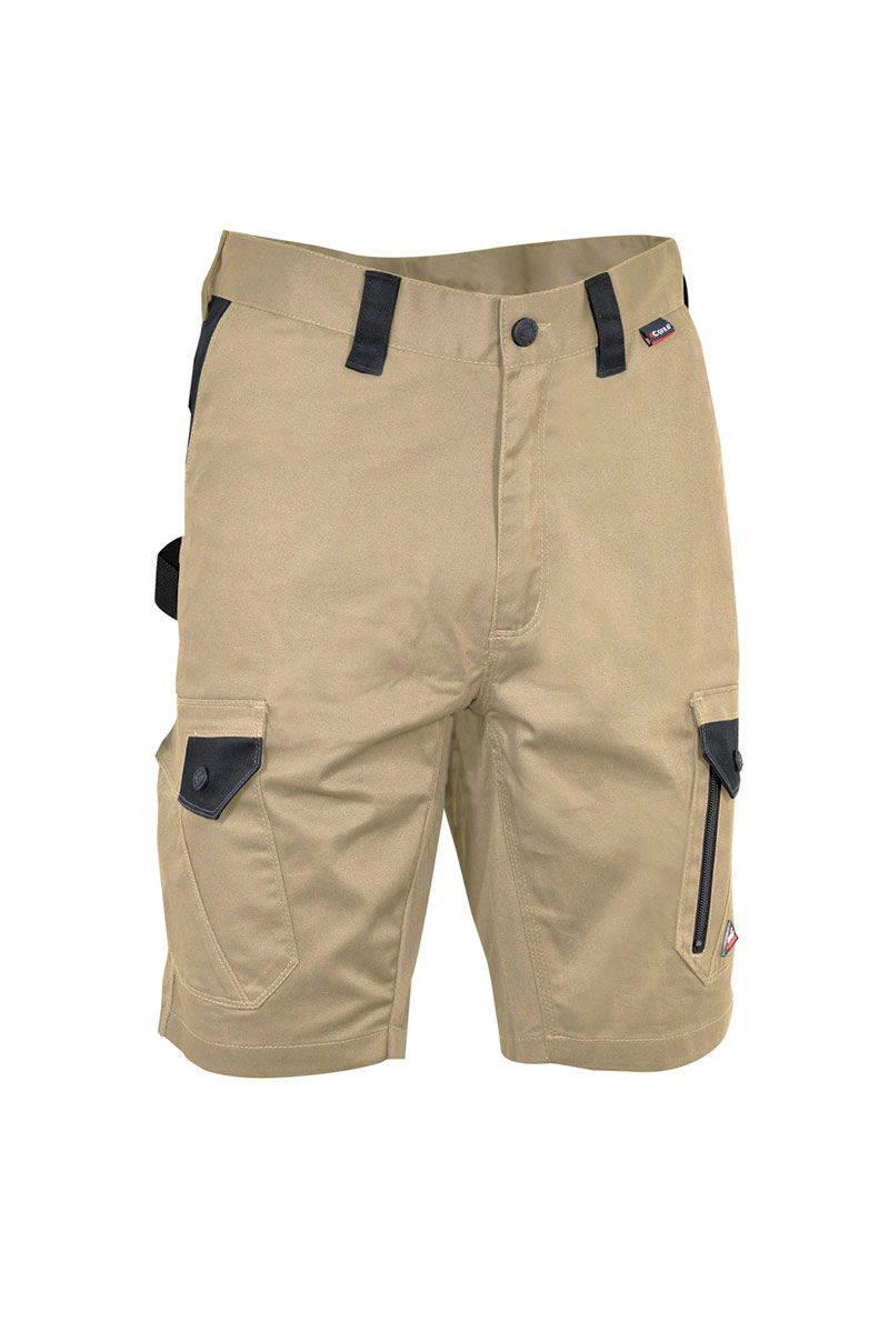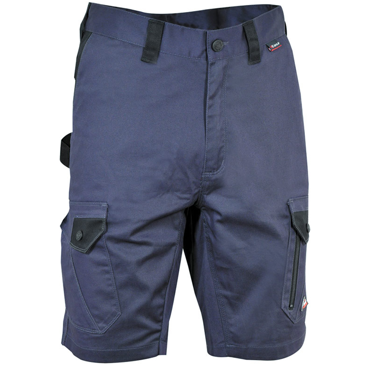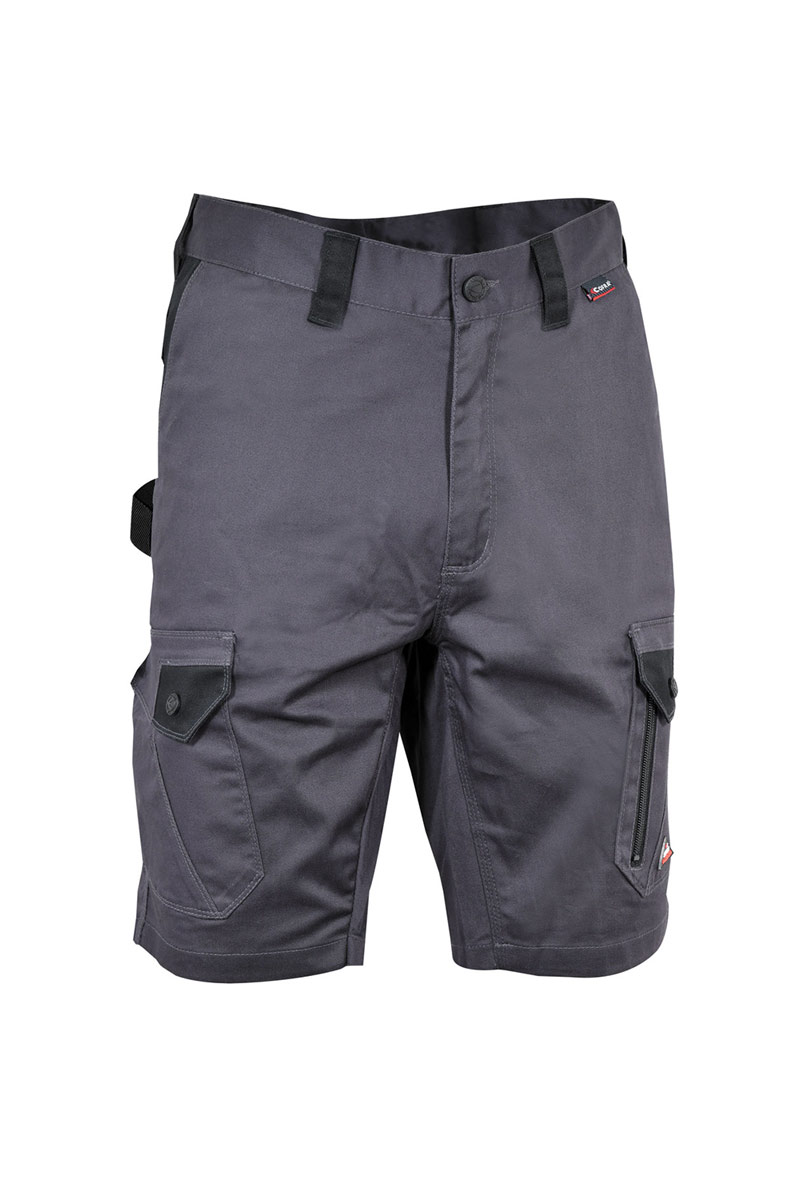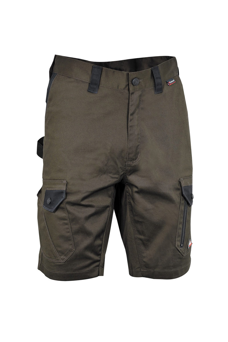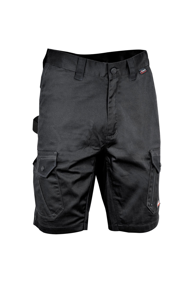 Bermuda de travail avec 2 poches larges à l’avant. Double poche postérieure avec patte fermée par snap. Passant porte-marteau. Poche latérale droite fermée par snap. Poche latérale gauche à double ouverture (fermeture avec snap et zip). Tissu très élastique. 60% coton – 37% polyester.