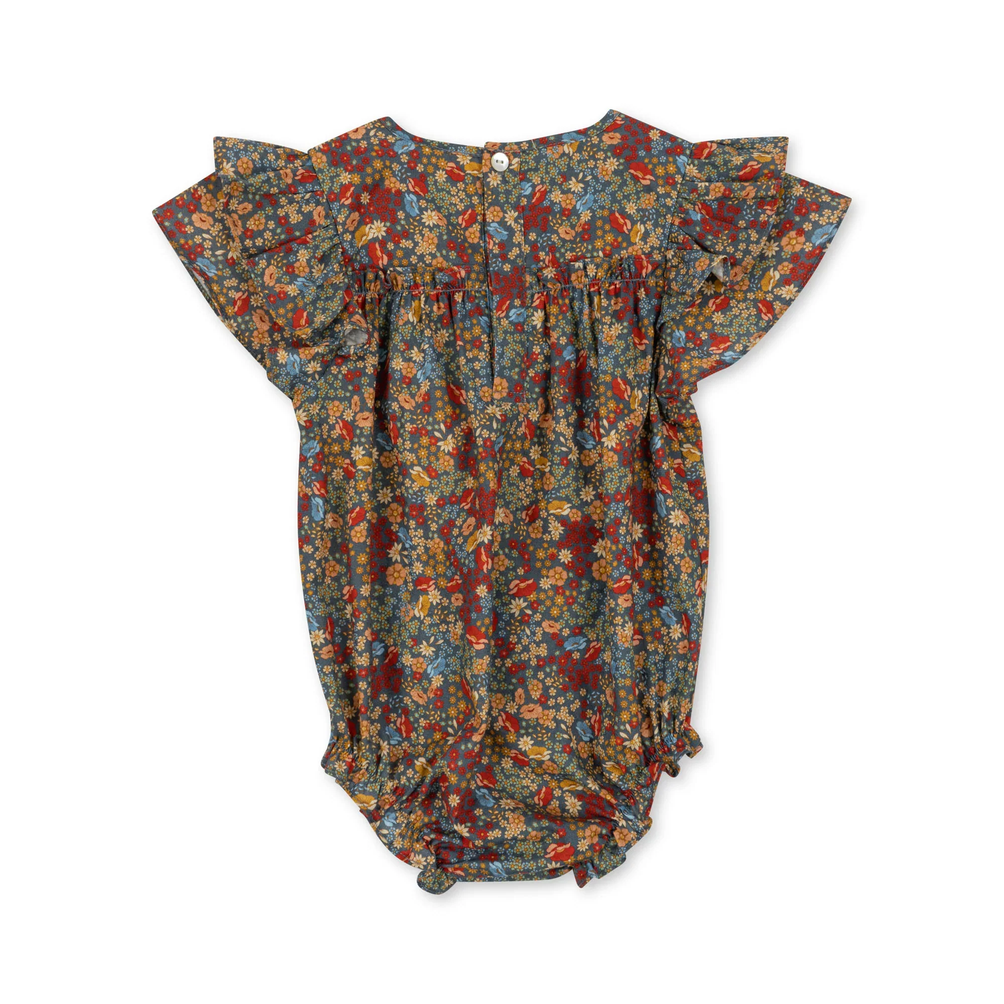 Romper gemaakt van 100% katoen, met ruches bij de armopeningen, borst en rug. Met elastische beenopeningen met babylockzomen en te sluiten met parelmoeren knoopjes in de nek. Drukknoopsluiting aan de onderkant voor eenvoudig aan- en uitkleden. Kenmerken Materiaal: 100% katoen Wasinstructies: Wassen op 30C
