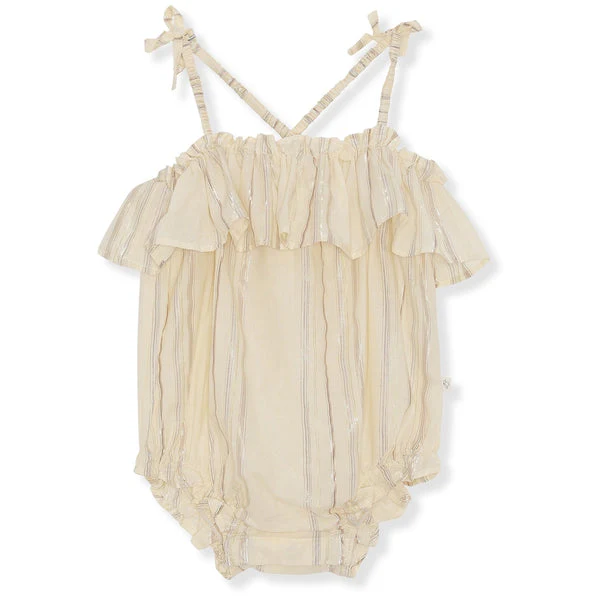 Schattige kleine FIJI romper van Konges Slojd met franjes en spaghettibandjes, perfect voor een warme lente- of zomerdag. De romper heeft knopen voor een gemakkelijke luierwissel Kenmerken Materiaal: 100% biologisch katoen Kleur: Champagne/multi lurex Wasbaar op 30 graden C