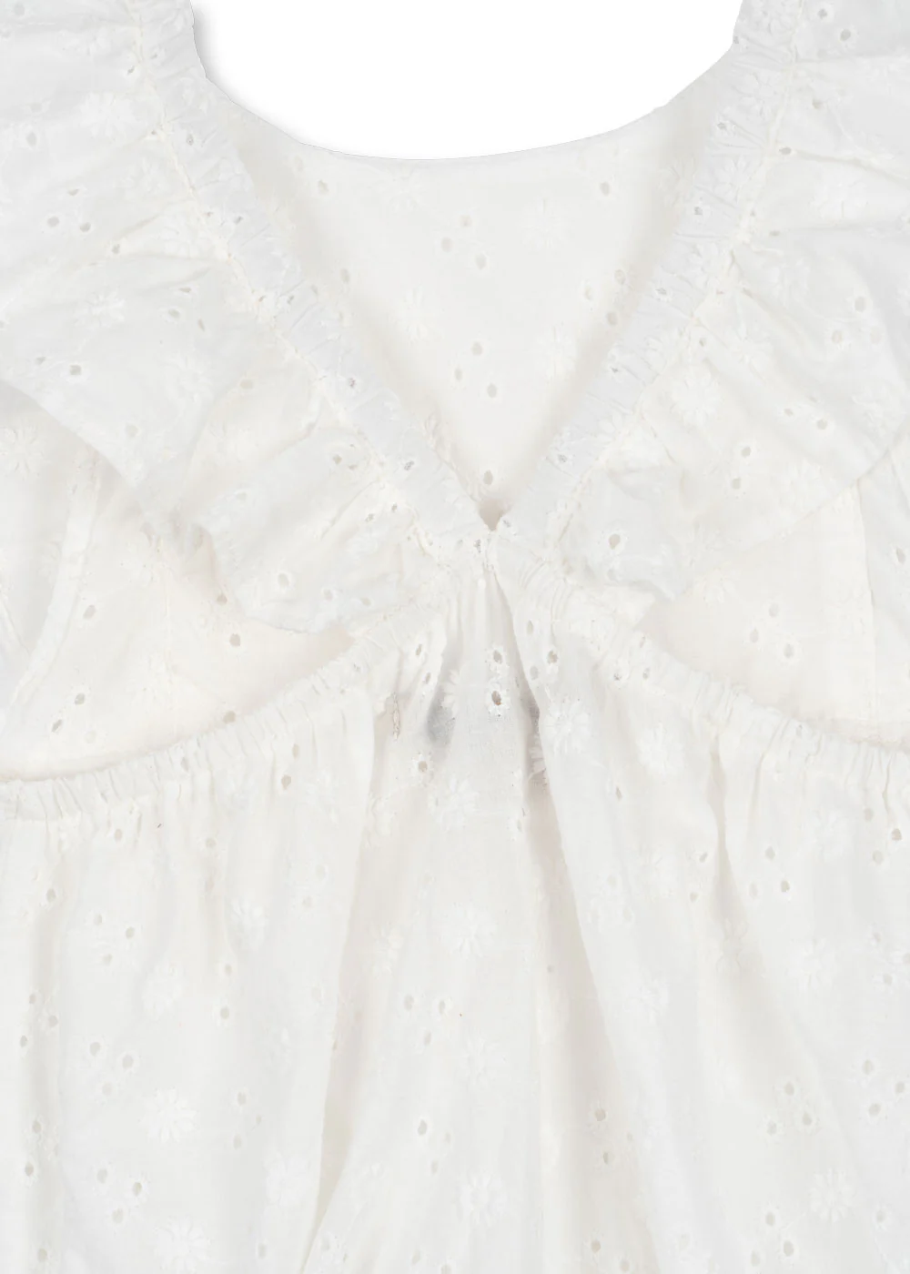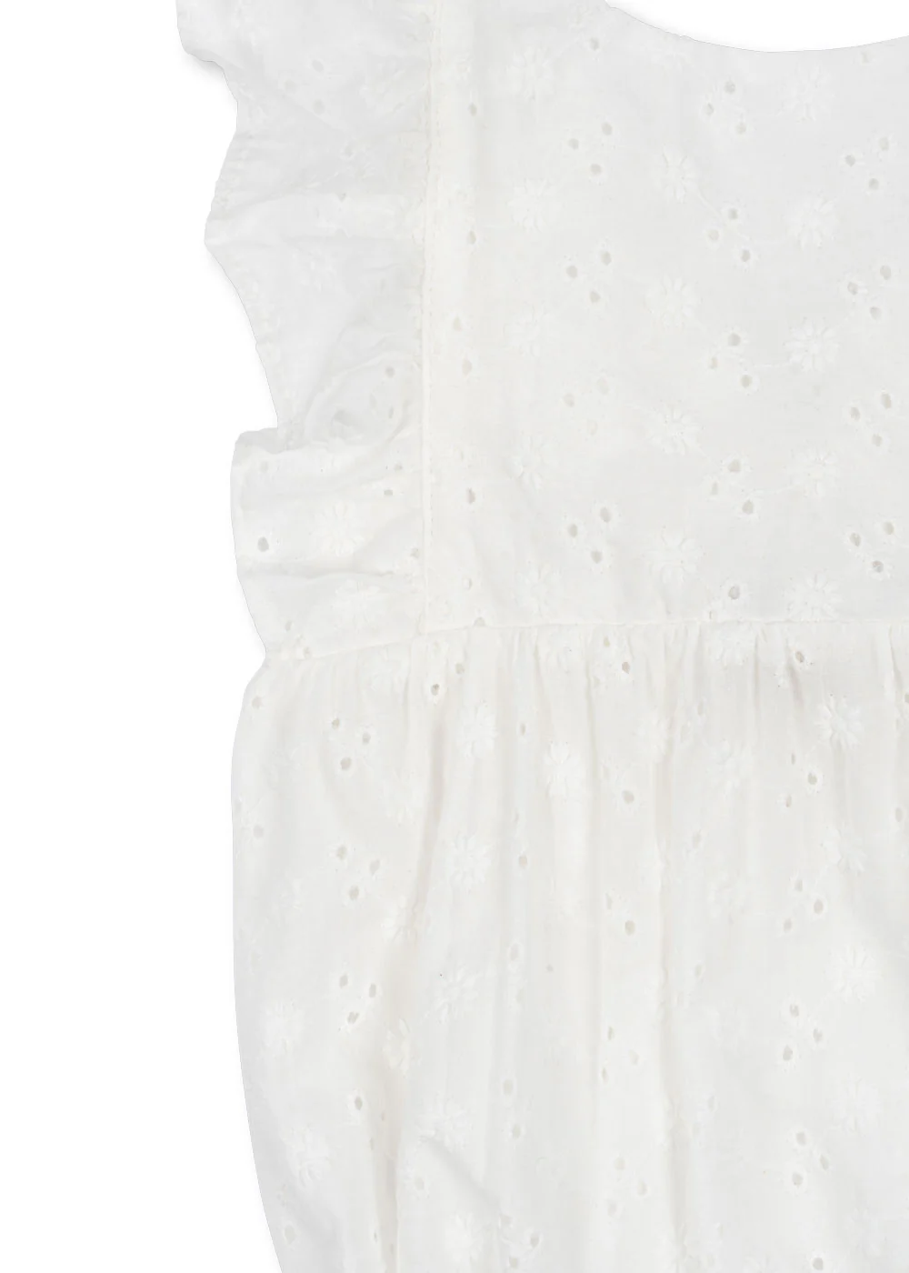 Luchtige mouwloze romper van Konges Slojd met broderie anglaise en ruches. Gemaakt van 100% katoen, ideaal voor zomerse dagen.