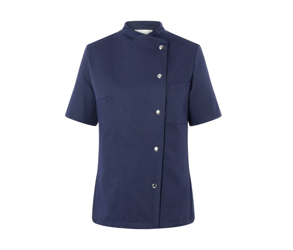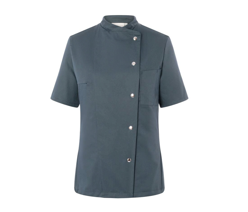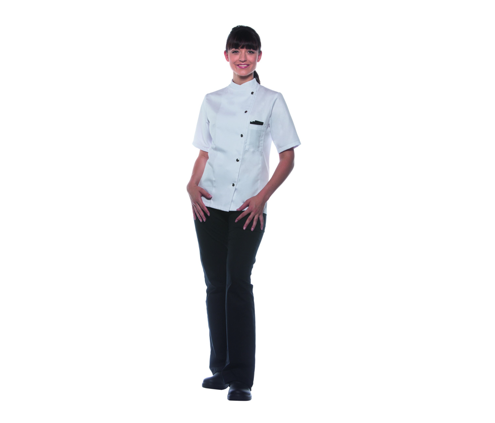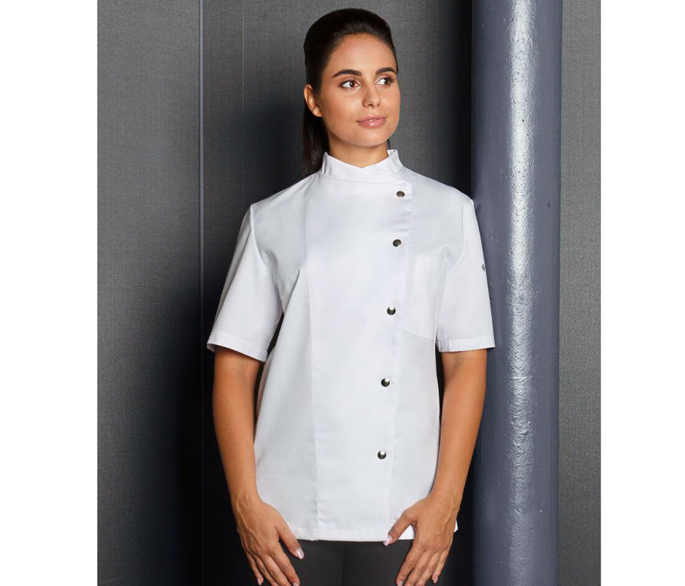 Veste de cuisine femme Greta. Coupe près du corps. Pinces poitrine. Découpes princesse à l’avant et à l’arrière. Manches courtes. Poche poitrine plaquée gauche. 5 boutons-pressions. Veste pré-rétréci, résistant au lavage, facile d’entretien. Convient au lavage industriel. 65% polyester/35% coton.