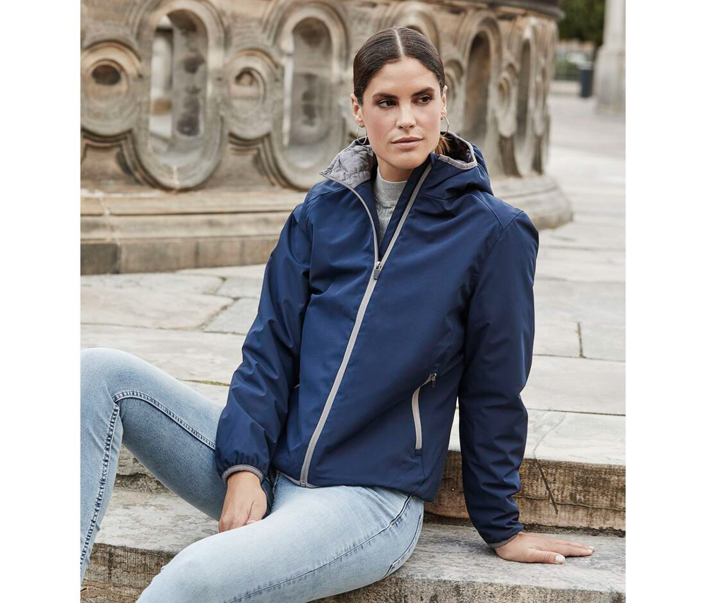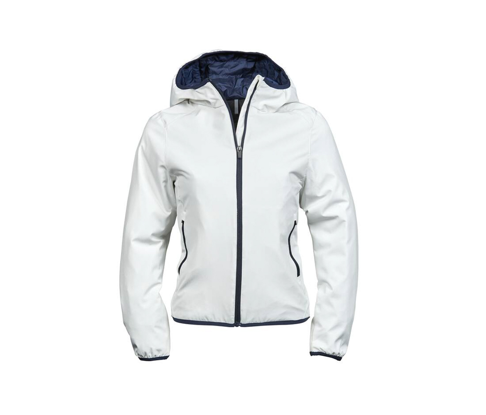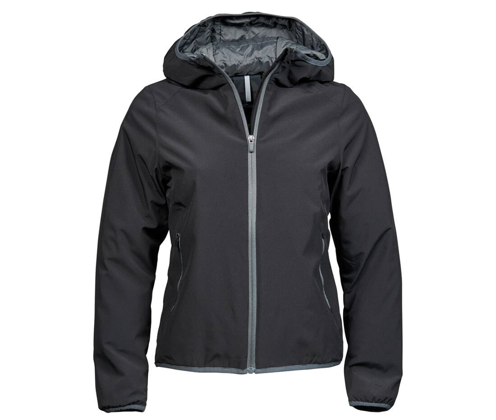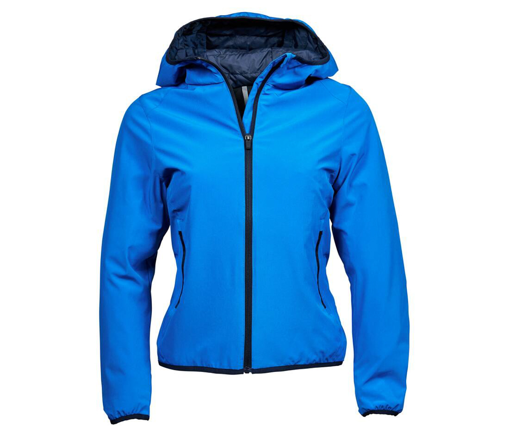 Veste compétition femme. Veste de sport Softshell 2 couches. Grand zip. Bonne isolation grâce à la qualité du rembourrage DuPont™. Capuche intégrée avec liseré contrasté et coutures décoratives. Protège-menton. 2 poches latérales zippées. Poche intérieure zippée. Ourlet et poignets élastiqués. 88% polyester/12% spandex. Doublure: 100% polyester 310T, rembourrage DuPont™.