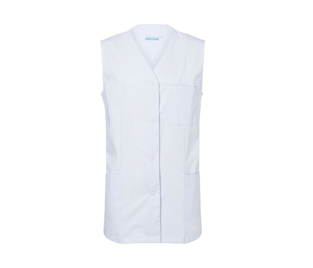 Casaque femme. Coupe ample et confortable. Coutures anglaises. Col V. Sans manches. 2 poches latérales discrètes. Poche poitrine à gauche. 4 boutons. 65% polyester/35% coton.