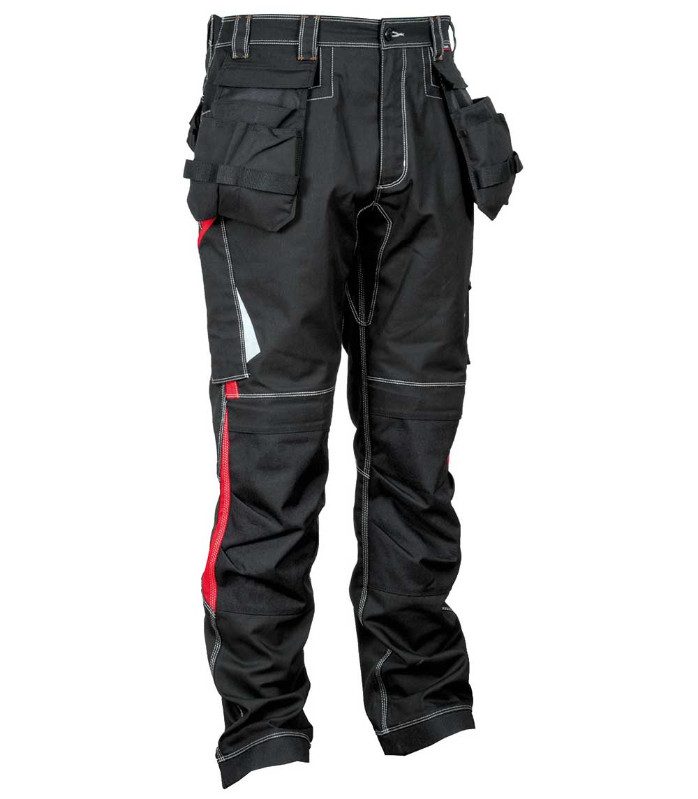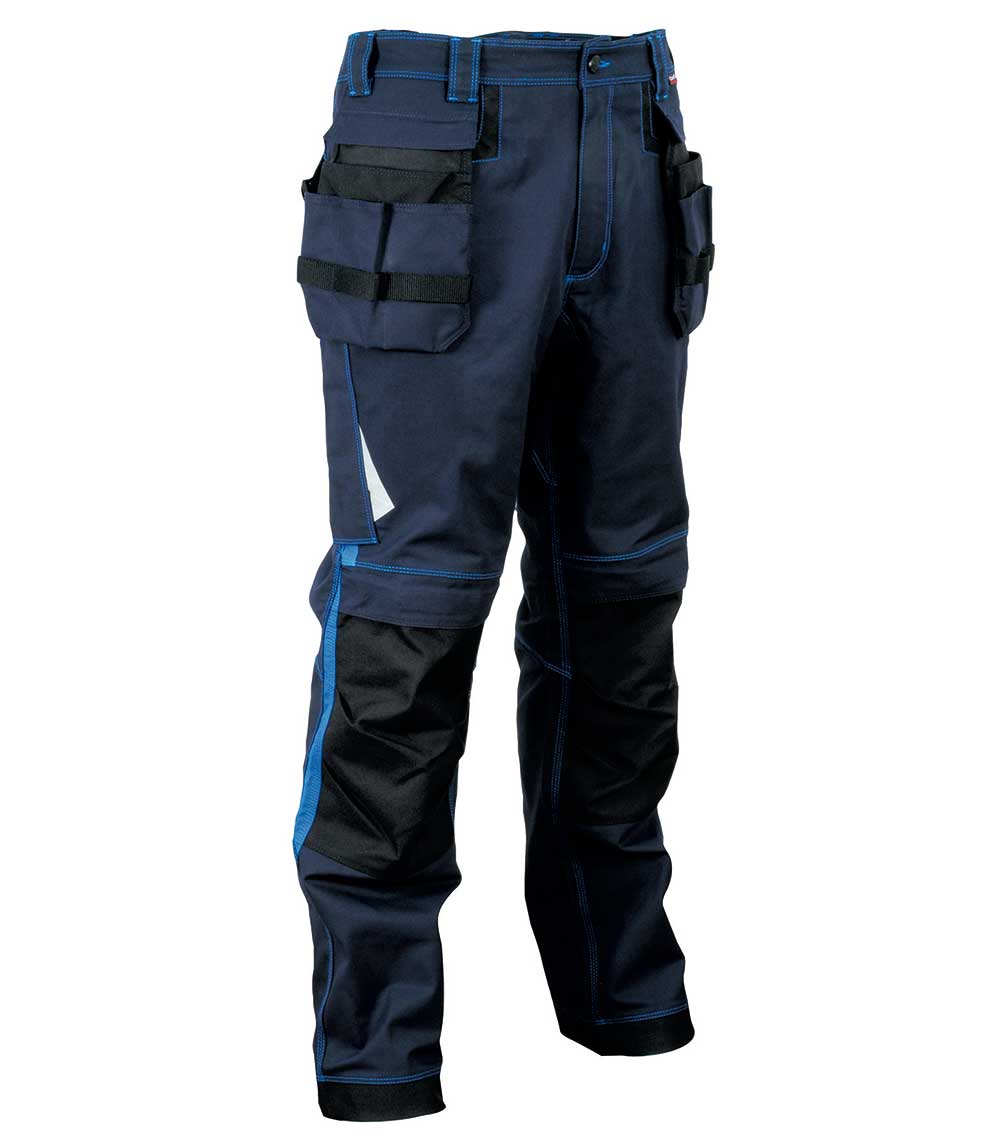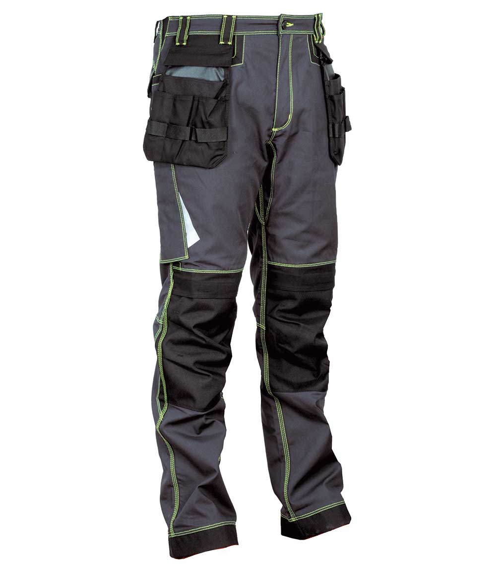 2 poches larges à l’avant. Double poche à l’arrière avec patte. Elastique à la taille. Entrejambe renforcé. Inserts anti-abrasion poches frontales. Inserts anti-abrasion sur le bas de la jambe. Inserts anti-abrasion sur le bas des poches arrières. Inserts réfléchissantes 3M™ SCOTCHLITE™ Reflective Material – 8712 Silver Fabric. Jambes et genoux à coupe ergonomique. Passant porte-marteau ajustable. Poche latérale. Poche pour mètre pliant. Poche pour téléphone portable. Poches extérieures porte-clous en nylon. Détachables avec le zip. Poches pour les genouillères en nylon ajustables. Tissu élastique. Zip YKK® 64% polyester – 34% coton – 2% élasthanne + inserts anti-abrasion en 100% nylon.