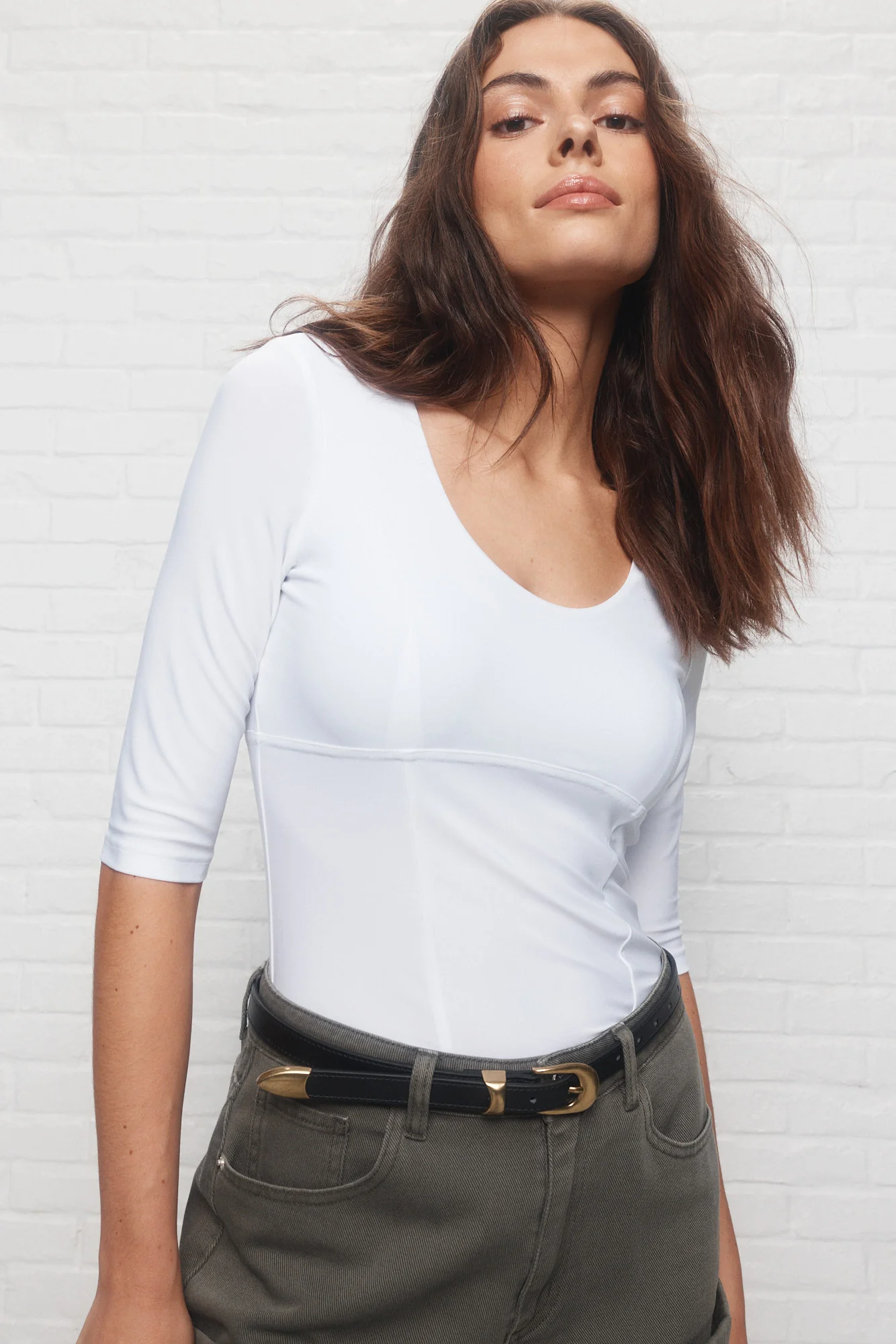 - Découpe verticale au bas du devant qui se prolonge en pinces à la poitrine