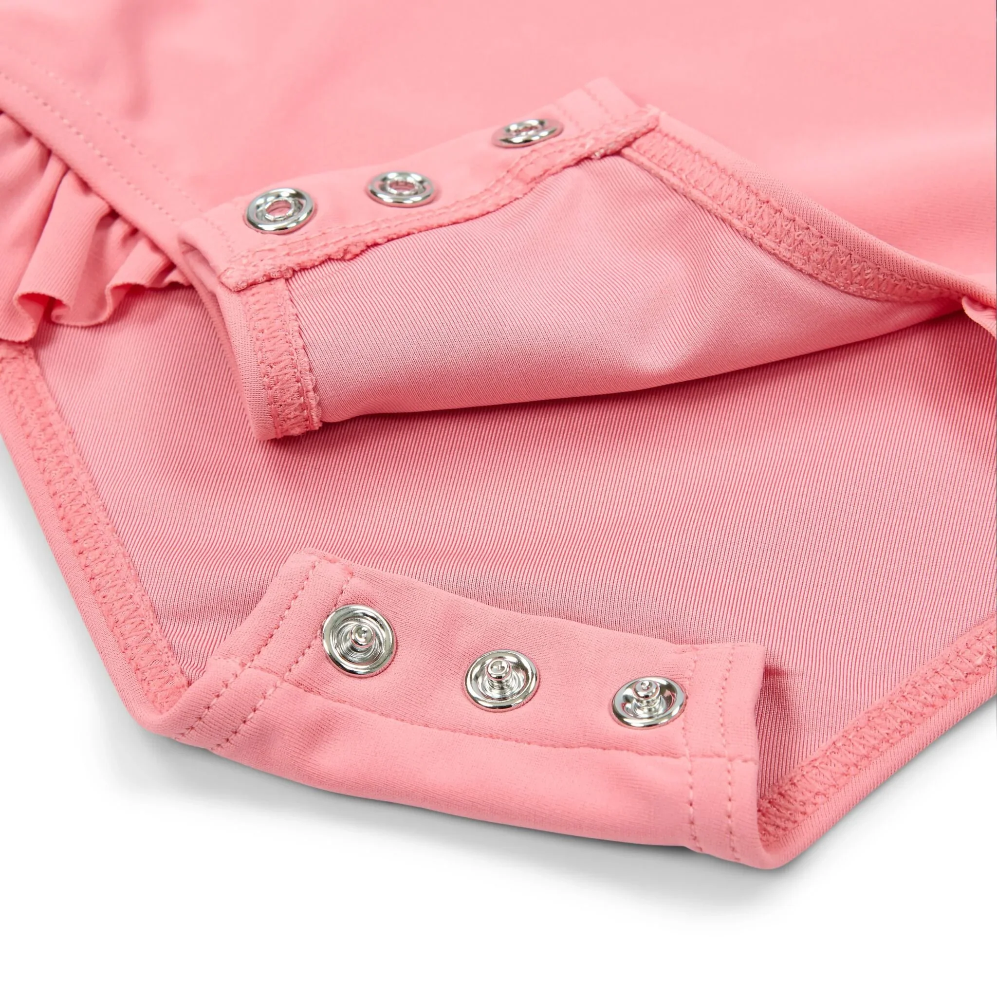 Voel het zand tussen je tenen – het is tijd voor het strand! Of je kleintje nu speelt in de golven of zandkastelen bouwt, dit schattige badpak zorgt gegarandeerd voor zomerse herinneringen. Het heeft een verfijnd dessin van roze bloemen en groene blaadjes op een zachte rouge-kleurige basis, wat een romantische en speelse uitstraling geeft.