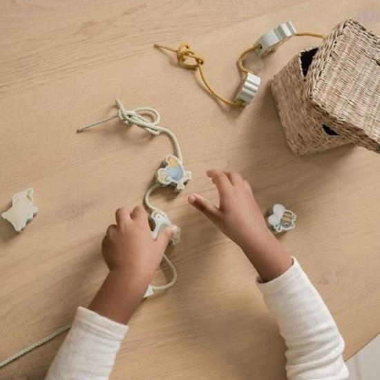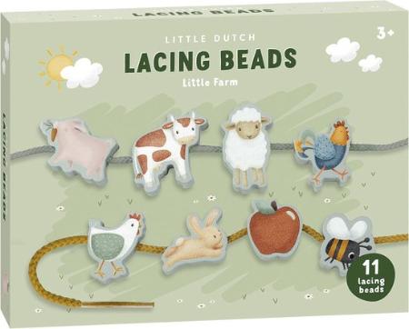 Deze set rijgkralen wordt geleverd met één veter en houten kralen voorzien van de prachtige illustraties van de Little Farm collectie. Peuters zullen het geweldig vinden om de kralen te rijgen en hun fantasie te gebruiken om de meest levendige verhalen te vertellen. Het spelen met de veterkralen bevordert de fijne motoriek, hand-oogcoördinatie en creativiteit.