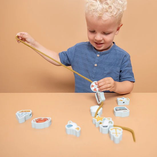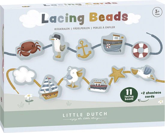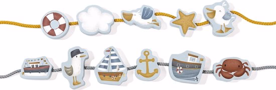 Ahoy, kleine matroos! Beleef telkens een nieuw avontuur in de baai met deze massief houten rijgkralen van Little Dutch. Deze houten kralen, met afbeeldingen van o.a. een vuurtoren, zeilboot en vogels uit de Sailors Bay serie, zijn extra groot en hebben een ruime uitsparing zodat kleine handjes ze makkelijk aan een veter kunnen rijgen. Inclusief 2 veters om aan te rijgen.