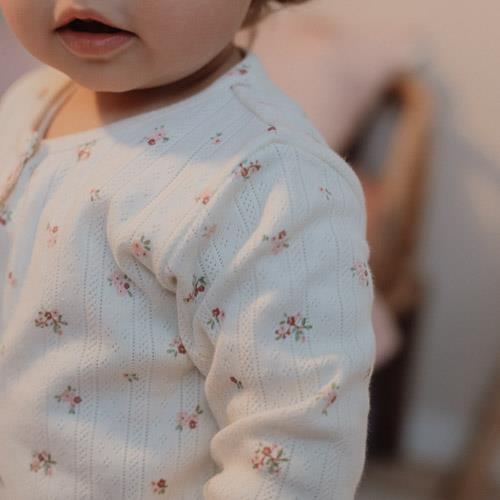 Deze schattige pyjama omhult je kleintje in zachtheid en comfort, perfect voor een goede nachtrust. De fijne pointelle structuur en de charmante bloemenprint geven een dromerige uitstraling. Met een fijn gestikt randje langs de sluiting en mouwen en een praktische drukknoopsluiting aan de voorkant en bij het kruis, is het aan- en uitkleden en verschonen van luiers een fluitje van een cent.