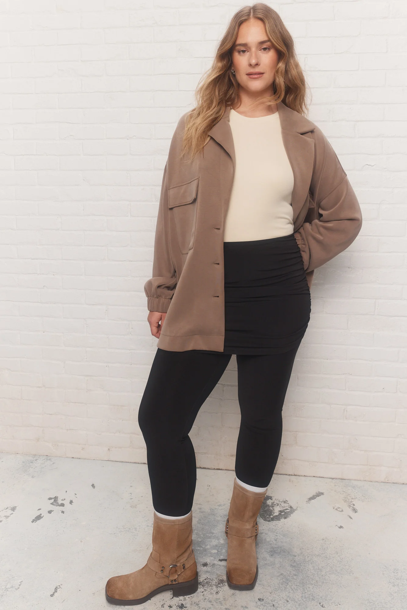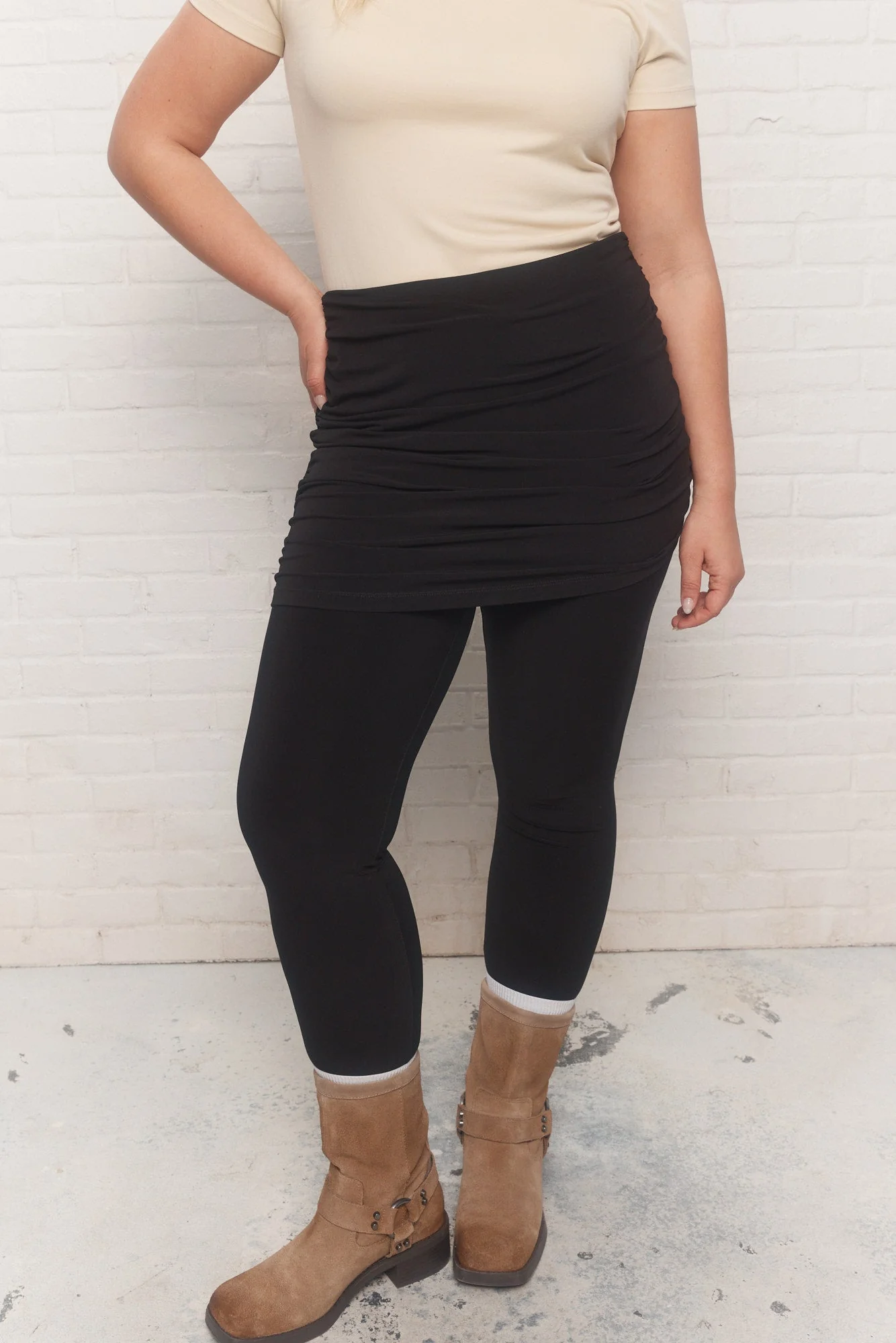 Unique, voici le legging noir avec jupe intégrée Mabel. Cousus ensemble, vous avez à la fois le chic d’une jupe et le confort d’un legging. Pratique, la jupe permet de camoufler la fourche du legging, tandis que ses fronces avantagent la taille.