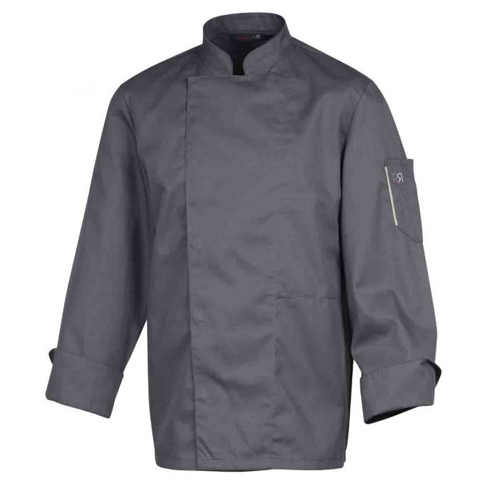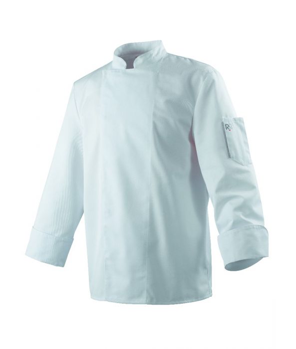 Veste de cuisine Col officier Boutons pressions cachés Liseré de couleur sur poche stylo Poche stylo plaquée sur manche