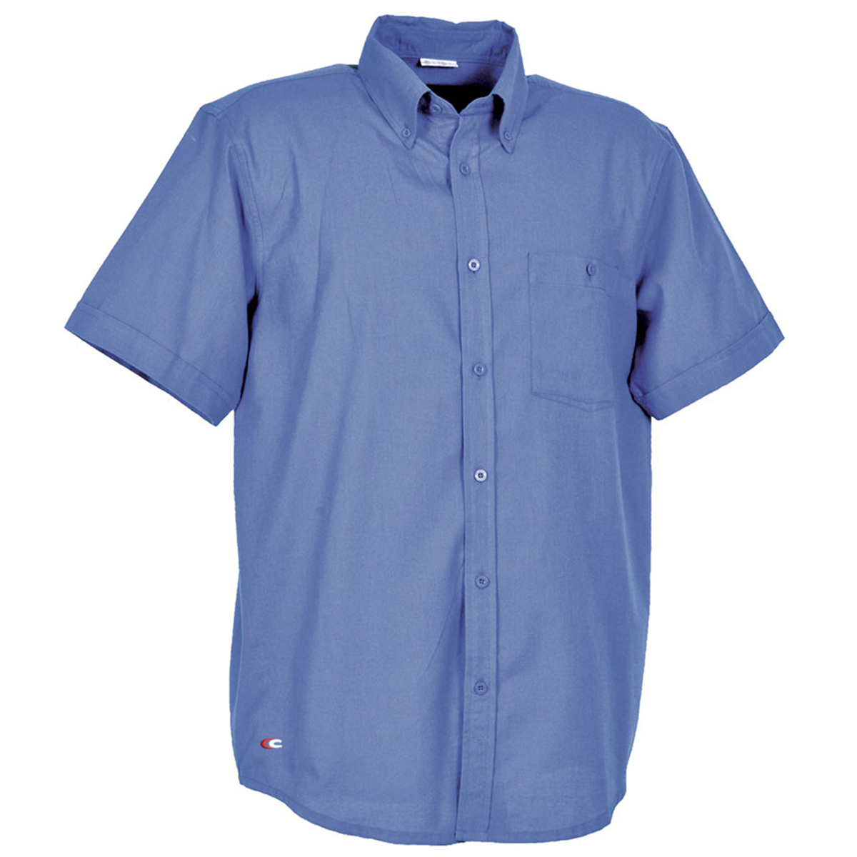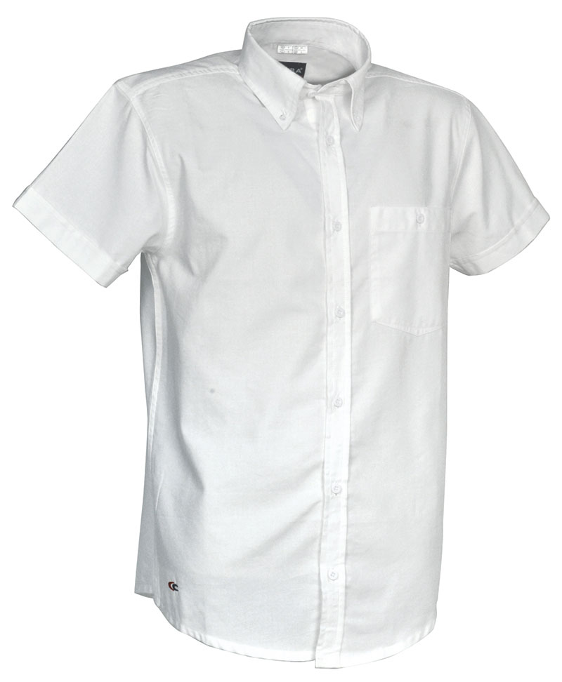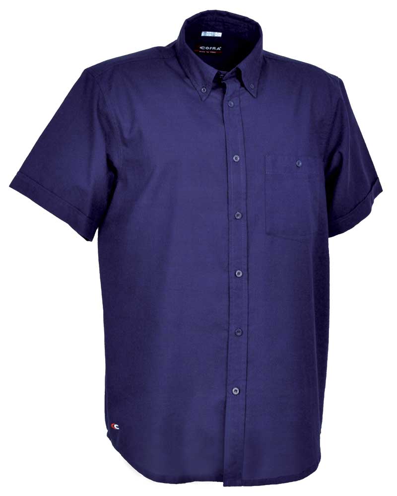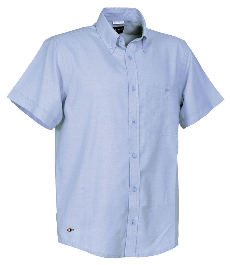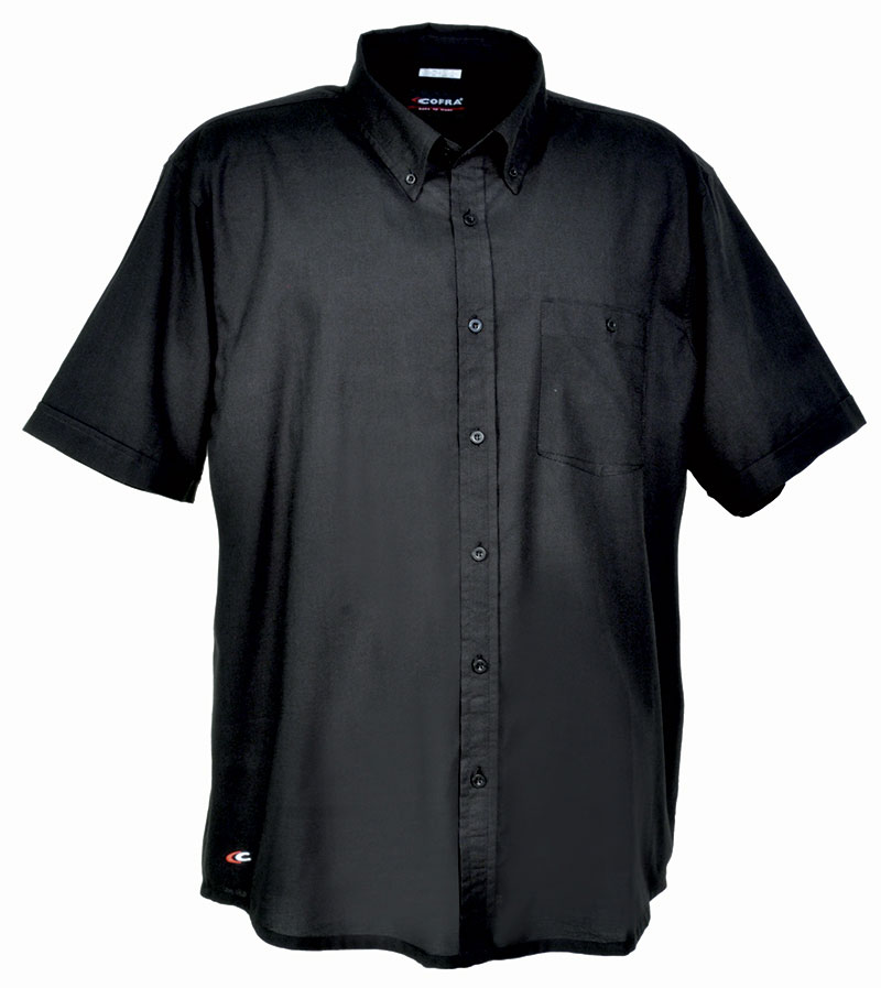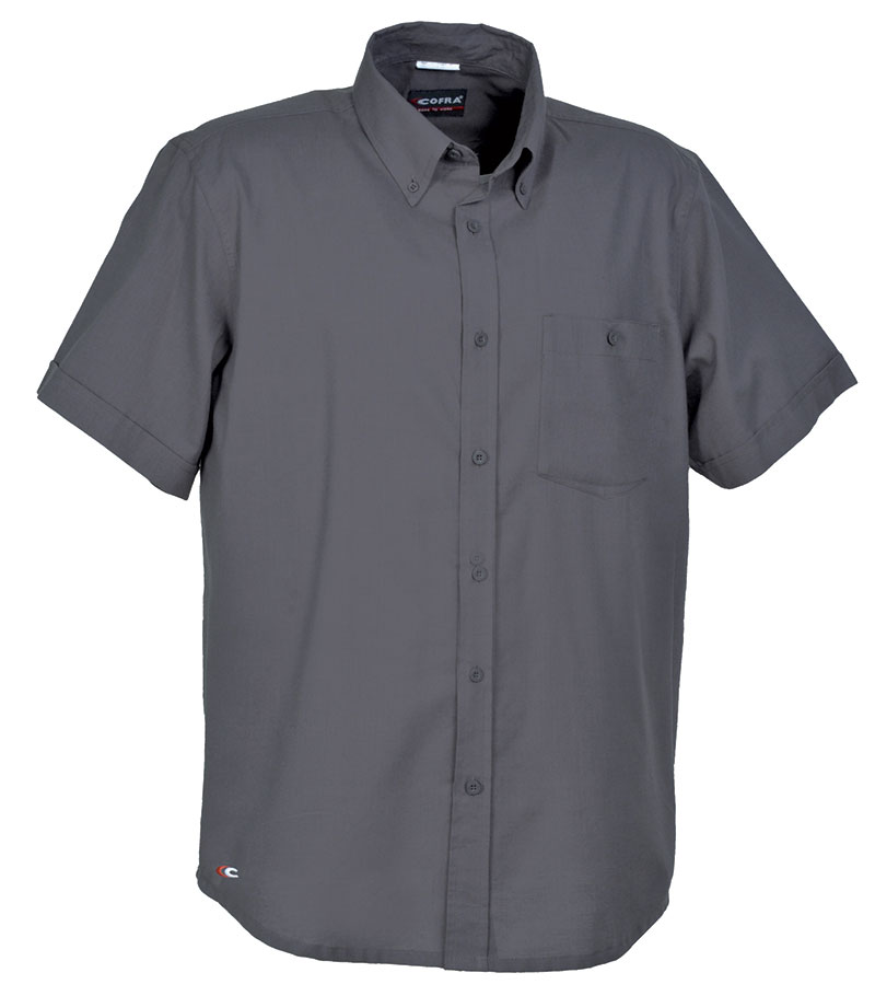 Arrondi en bas. Chemise manches courtes. Collet butonné (button-down). Fermeture boutons en plastique même couleur du tissu. Poche poitrine à gauche fermée par un bouton en plastique. Poignet avec rabat.