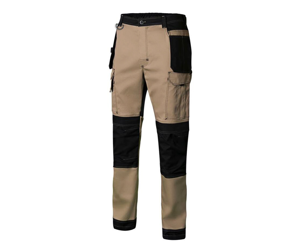 Fermeture à bouton avec braguette zippée Ceinture élastiquée. Renfort en tissu oxford sur les genoux et le bas du pantalon. Renfort en tissu à l’arrière. Poches pour genouillère, avec fermeture Velcro®. Double couture de sécurité. Pinces aux genoux. Anneau en plastique sur l’un des passants de la ceinture. Passants pour ceinture. Poches flottantes avec différents compartiments. 10 poches. 98% coton/2% élasthanne.