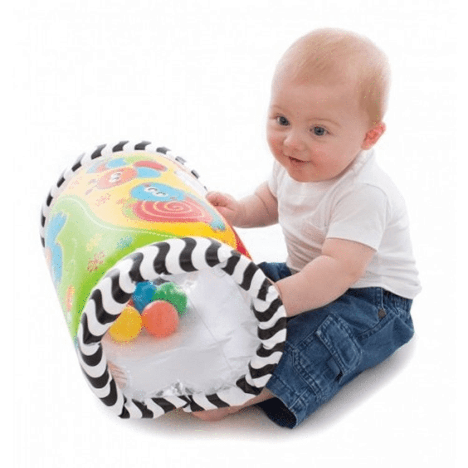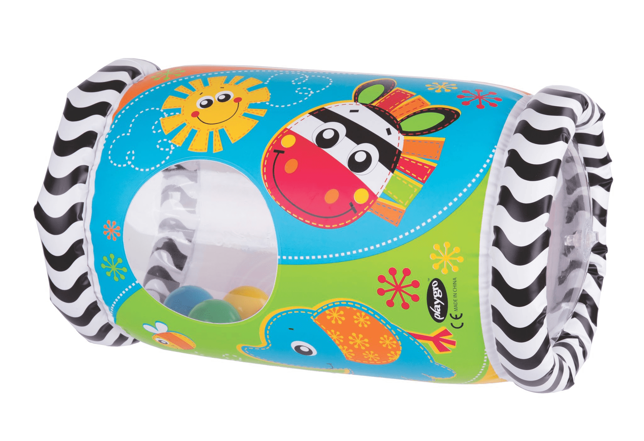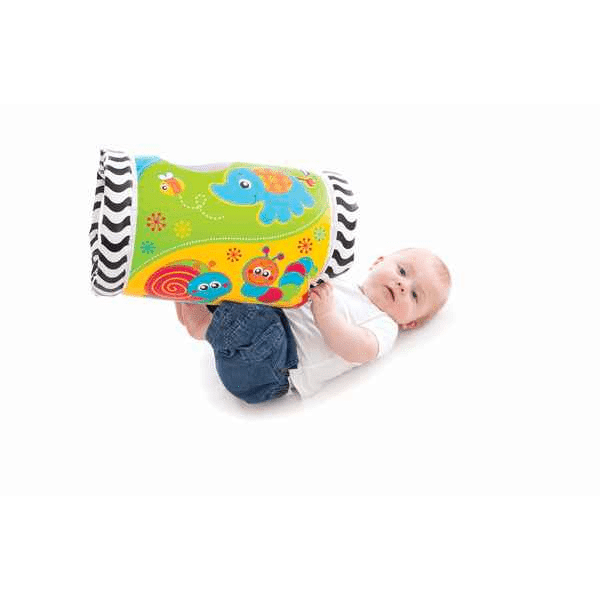 Kiekeboe! Deze opblaasbare Baby roller zal je baby aan moedigen om te grijpen, gooien en schudden. De roller heeft een leuke, kleurrijk design en is gevuld met ratelende ballen. Baby’s gebruiken hun nieuwsgierigheid om elke verschillende manier te zoeken om een kijkje te nemen in deze leuke rol. Door het zachte, opblaasbare materiaal kan de baby ermee gooien, er over heen rollen en ermee schudden voor uren speelplezier.