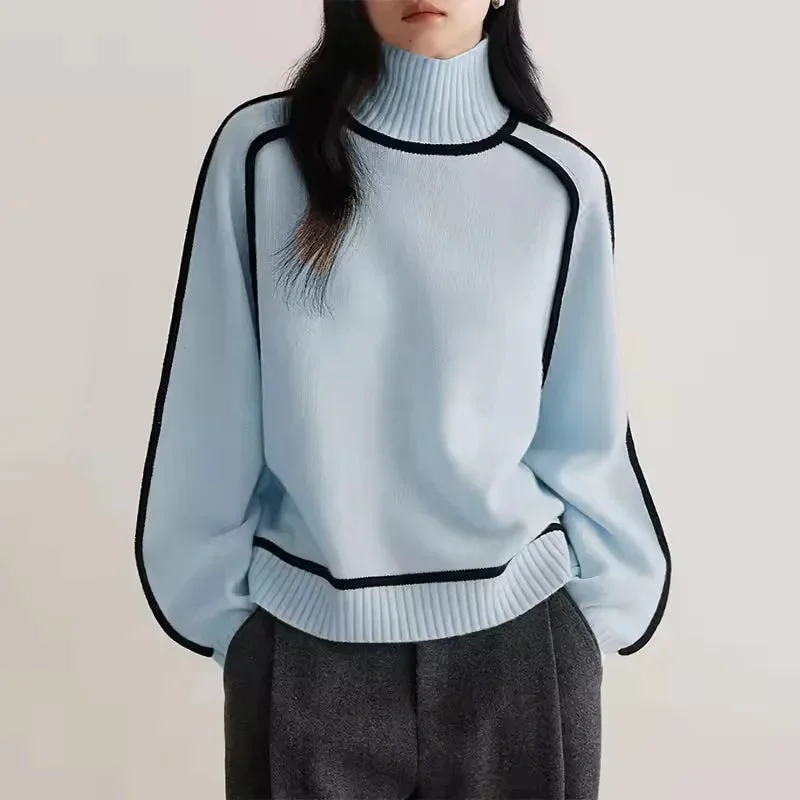 Pull col roulé femme avec bordure contrastée