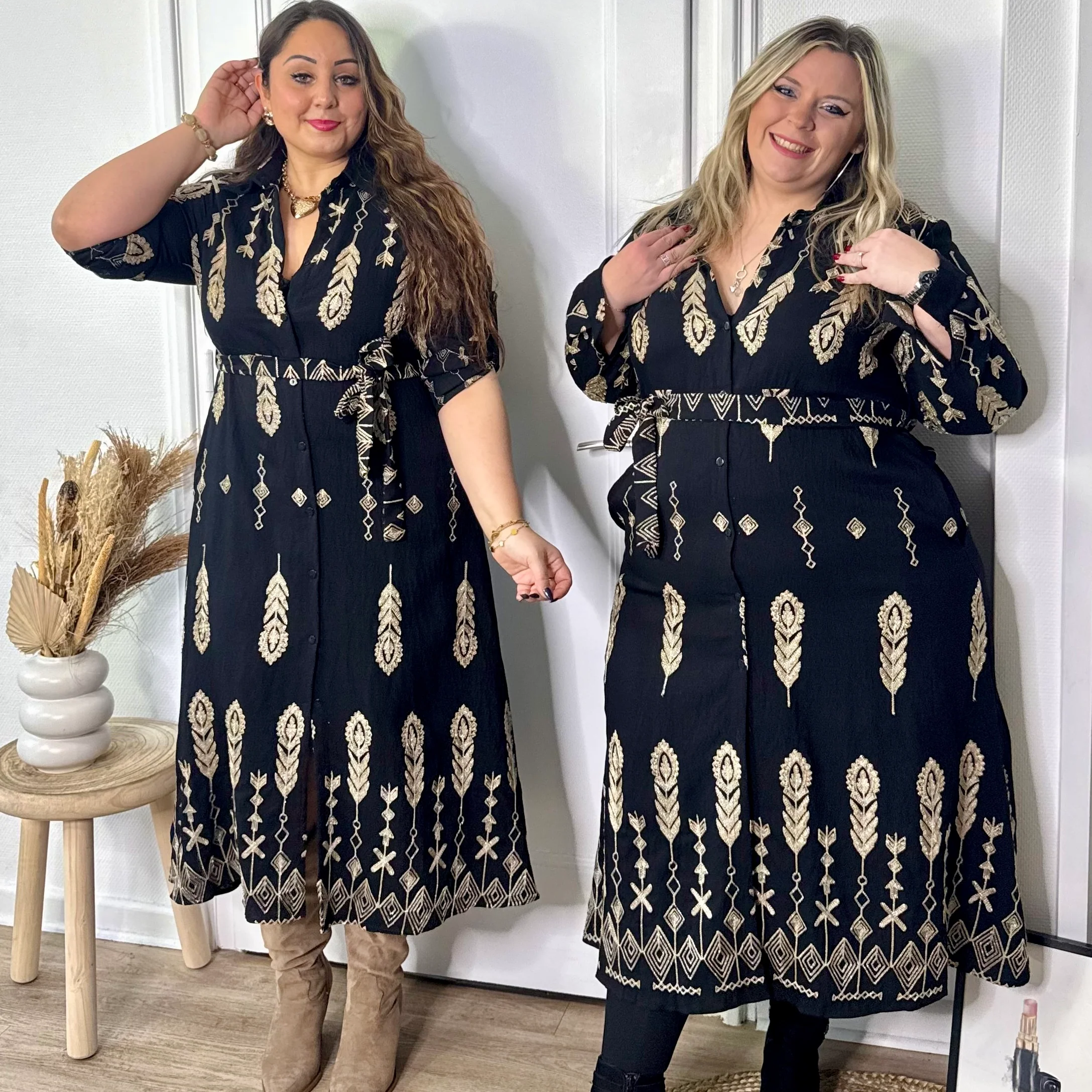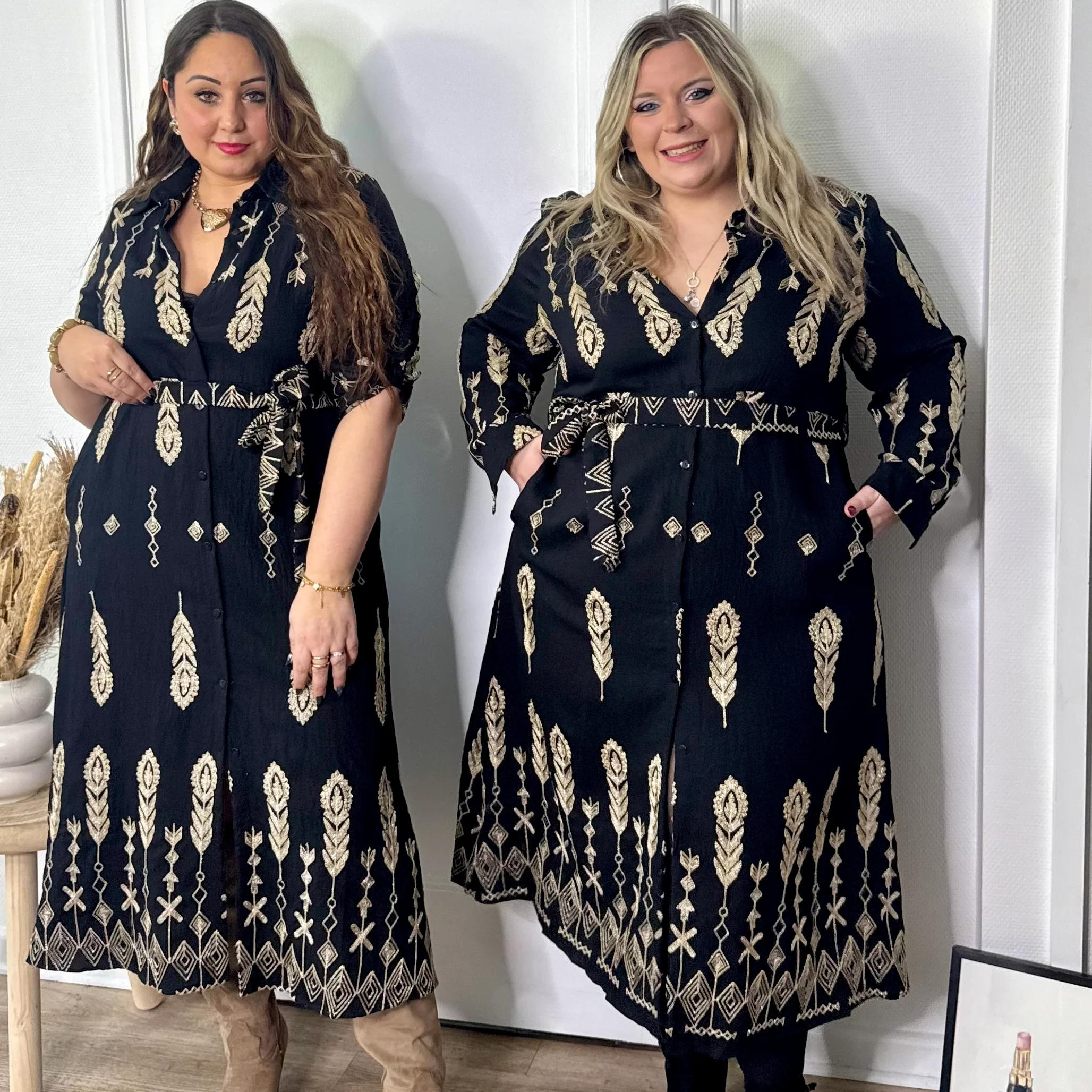 Chic et élégante, cette robe chemise longue noire sublimée par un imprimé doré apporte une touche raffinée à votre silhouette ✨🖤. Les manches peuvent être retroussées grâce à un bouton, elle est également dotée de poches.