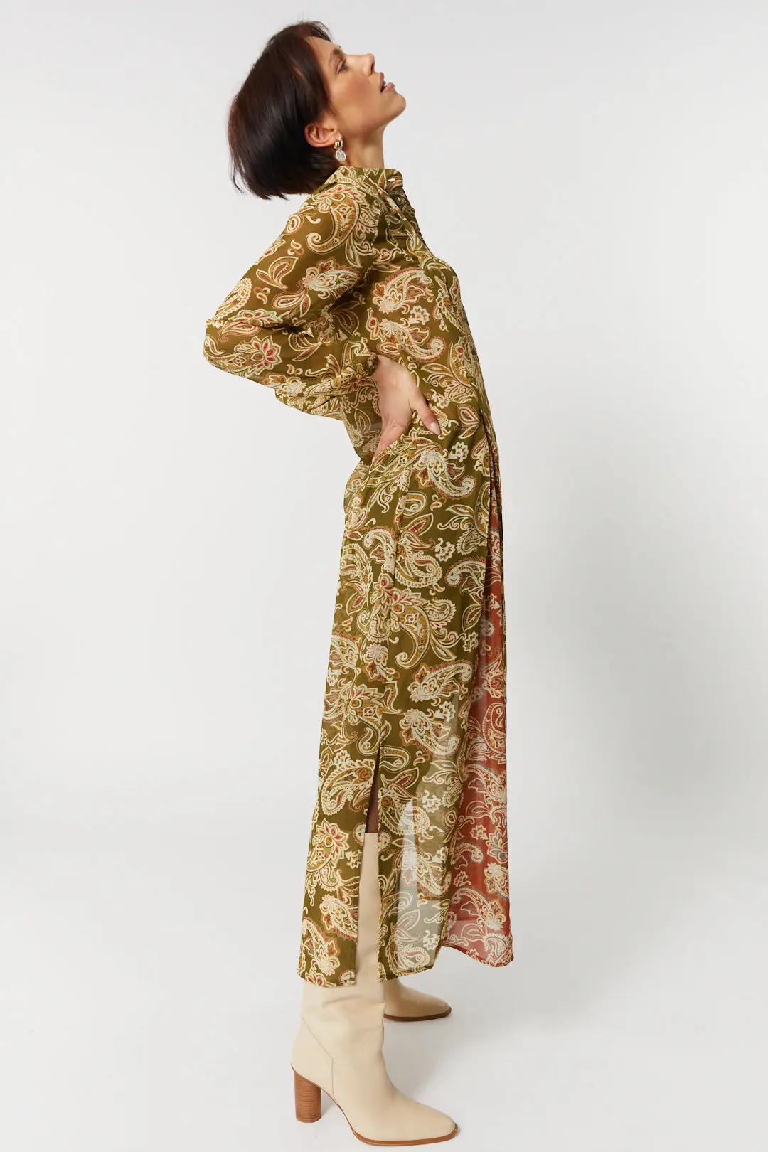 Aya, la robe longue possédant un imprimé paisley unique. Celle-ci se démarque par sa coupe recherchée ainsi que ses détails sophistiqués. Elle ajoutera un côté raffiné à vos agencements grâce à son tissu léger et son foulard intégré.