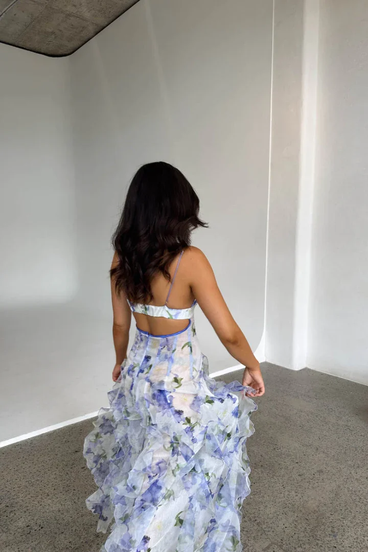 Robe longue blanche et bleue fleurie à volants avec corset | robe invitée mariage été