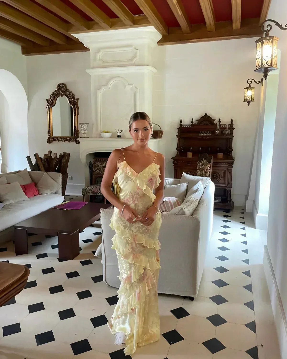 Robe longue à volants motif floral jaune